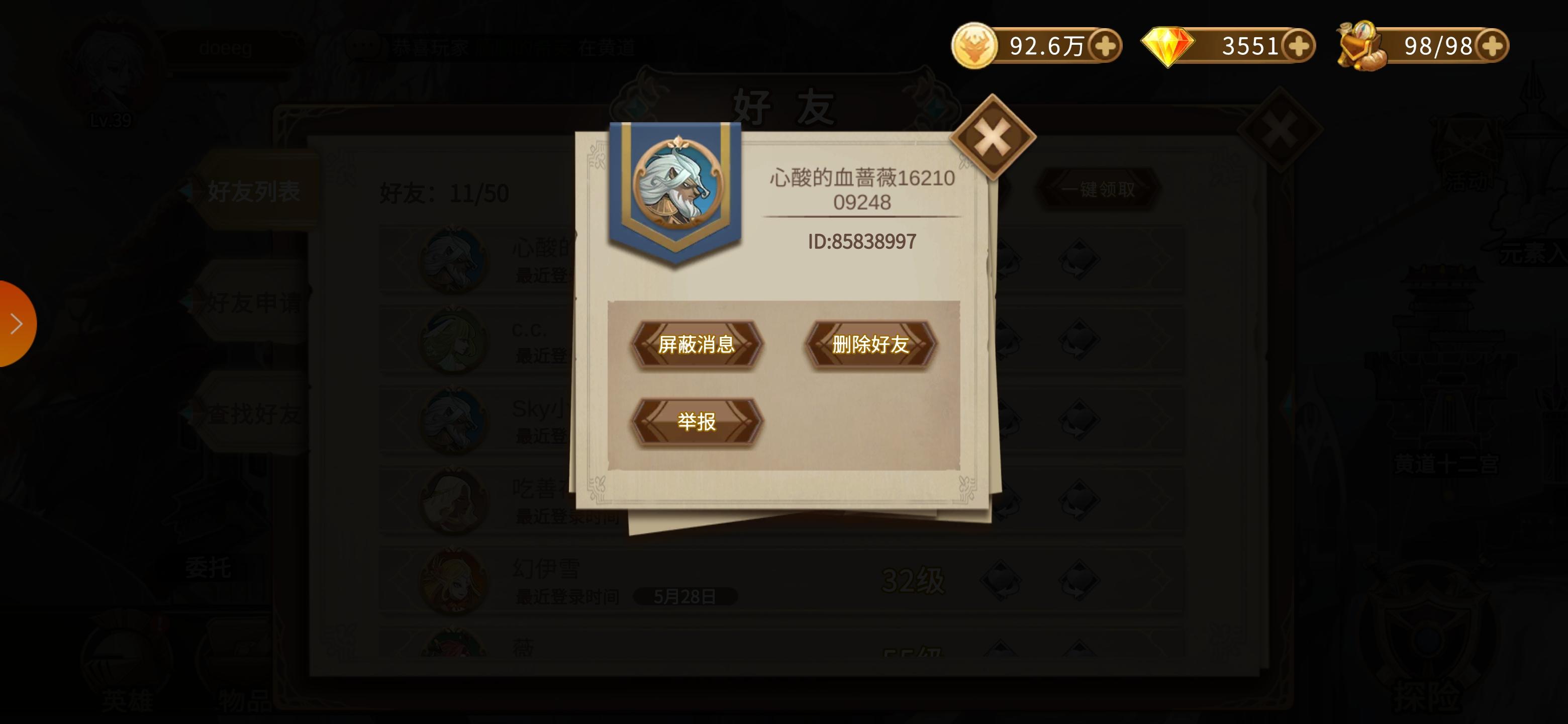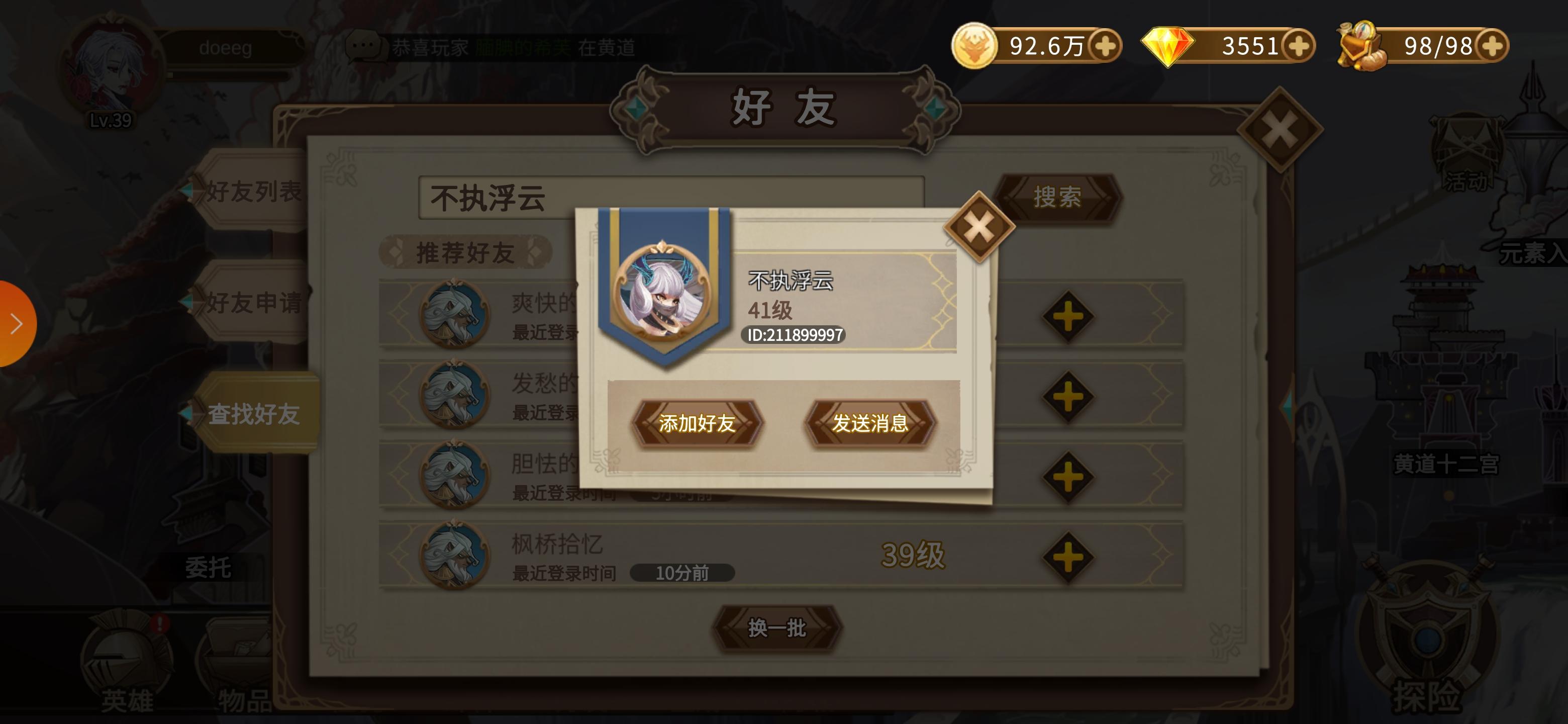 所以我发现了,这游戏是根本没做好友系统,目前来看,好友间唯一的功能就是领领爱心,还没什么用,甚至不能互相发消息,而搜索用户名弹出来的发送消息按键也是个假的