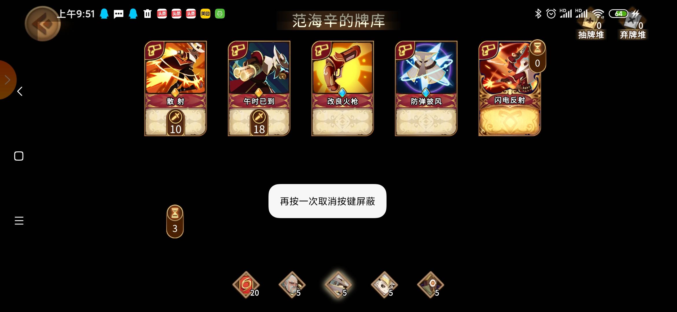 看右上角 抽牌 弃牌都没有卡 手牌里也没有。所有卡成了一次性消耗品 范海辛十二宫。