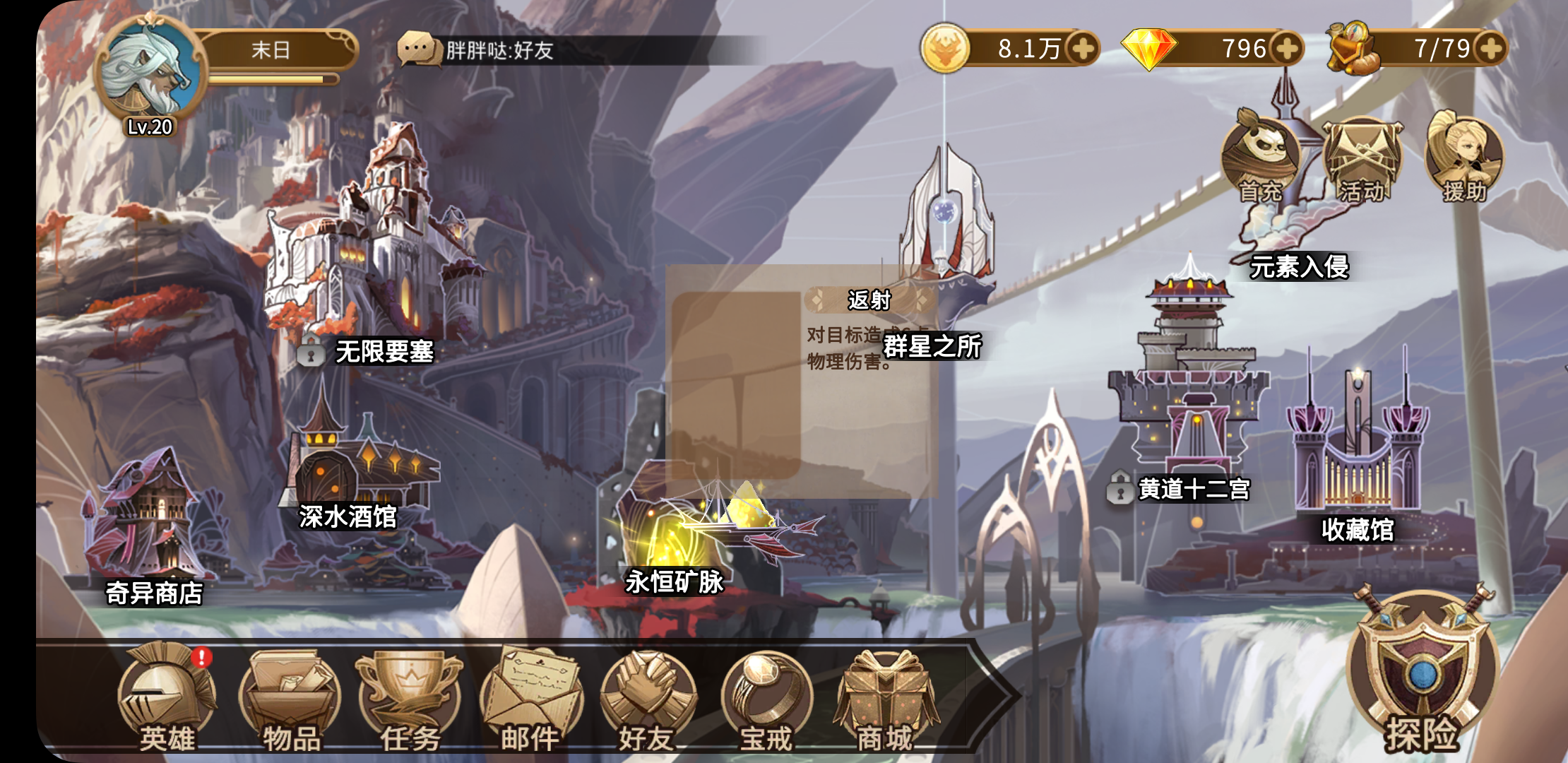 打完15关后弹出下一环节的奖励,点了下英雄就一直卡这个界面,登出游戏也还是这个画面