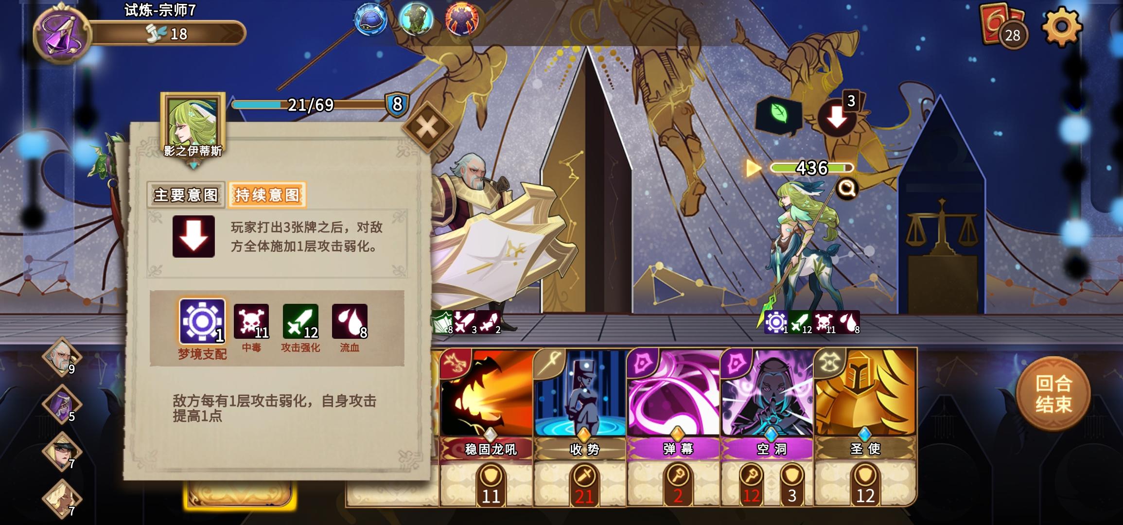 问题:十二宫,敌方特技我方出每6张牌我方所有人降1攻击敌方加1攻击,而且持续时间无限,这设定不合理。敌人还能回血,一次回60,所以绝了只有一两个状态人物磨死的路子,这等于除了特定队伍其他组合必定打不过。而十二宫随机性很大,你们可以设定战斗难度很大,但不能设定成碰到哪个怪必输。 建议:减攻改成持续两回合,这样拼了几回合不出牌掉很多血也能打。
