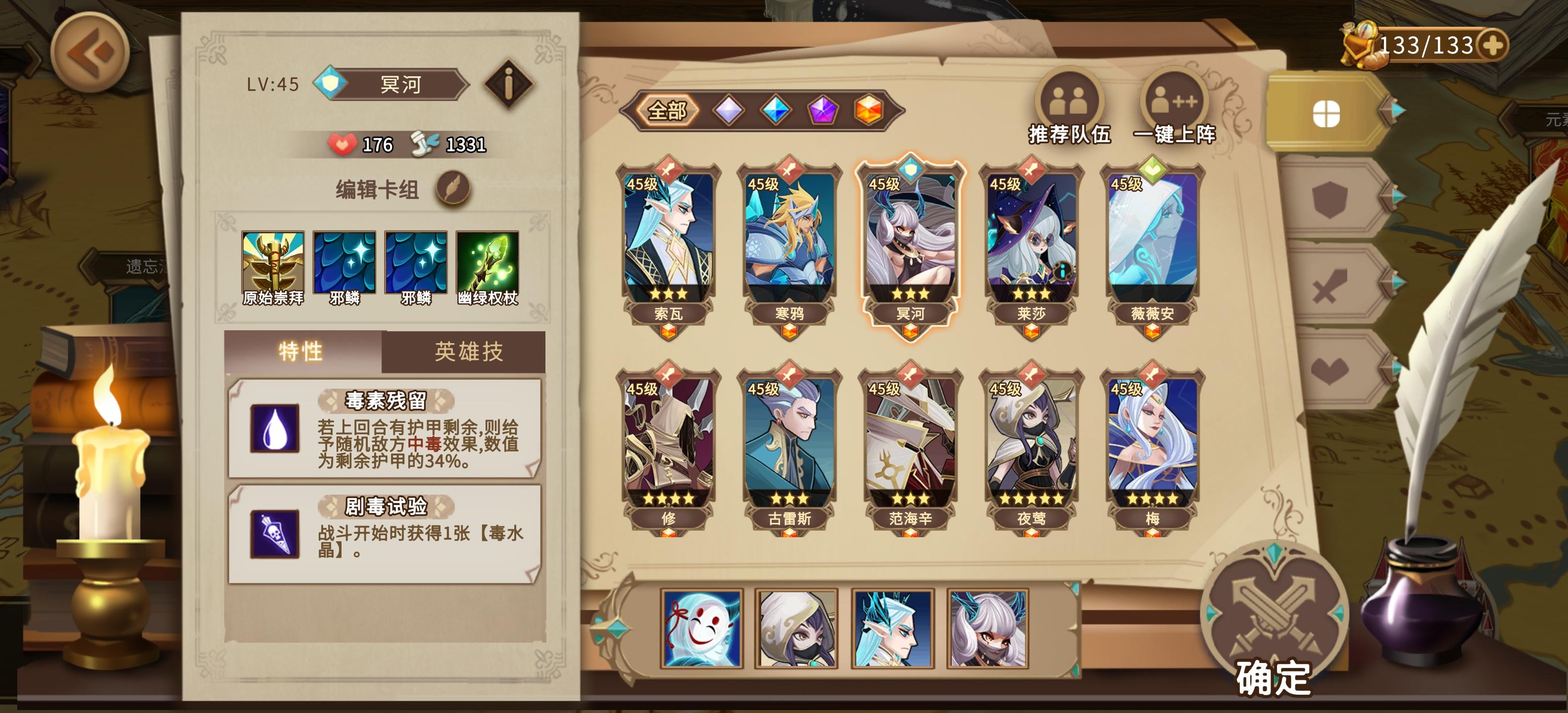 大佬们,求帮忙配一下阵容,卡暂时就下面这一些1.想玩毒队,但是没有冥河,应该用哪个t呢,毒队现在应该怎么配?2.索瓦配哪几个伤害最高?我是索瓦双姝莱莎血蔷薇,就是点的太多了3.现在我的卡组里还有没有强一点的卡组?