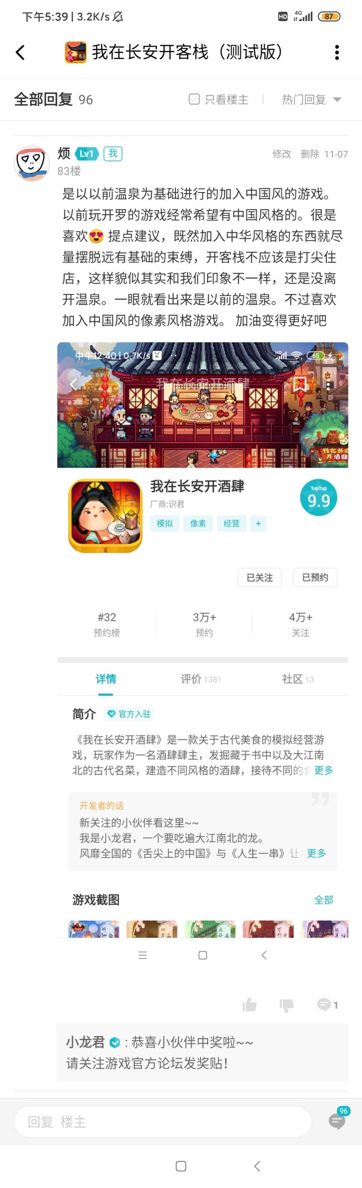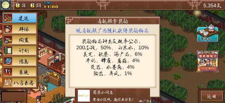 1如果能加入一个建筑使用多少次可以升级并做出升级后新的像素模型就好了。(或者花钱翻新一下店铺)这样子玩下去的动力upup啊!2希望添加一个大厅!就像古时候客栈里边大侠,歇脚的农夫,视察的官员凑在大厅里听说书人。3如果能有楼层就好了,不过看这样子是不可能了。(把原来的土地折成1/4,可以盖四楼。对应可以放楼梯就像1楼是大厅,杂物,厨房,温泉2楼是娱乐3楼购物4楼住房