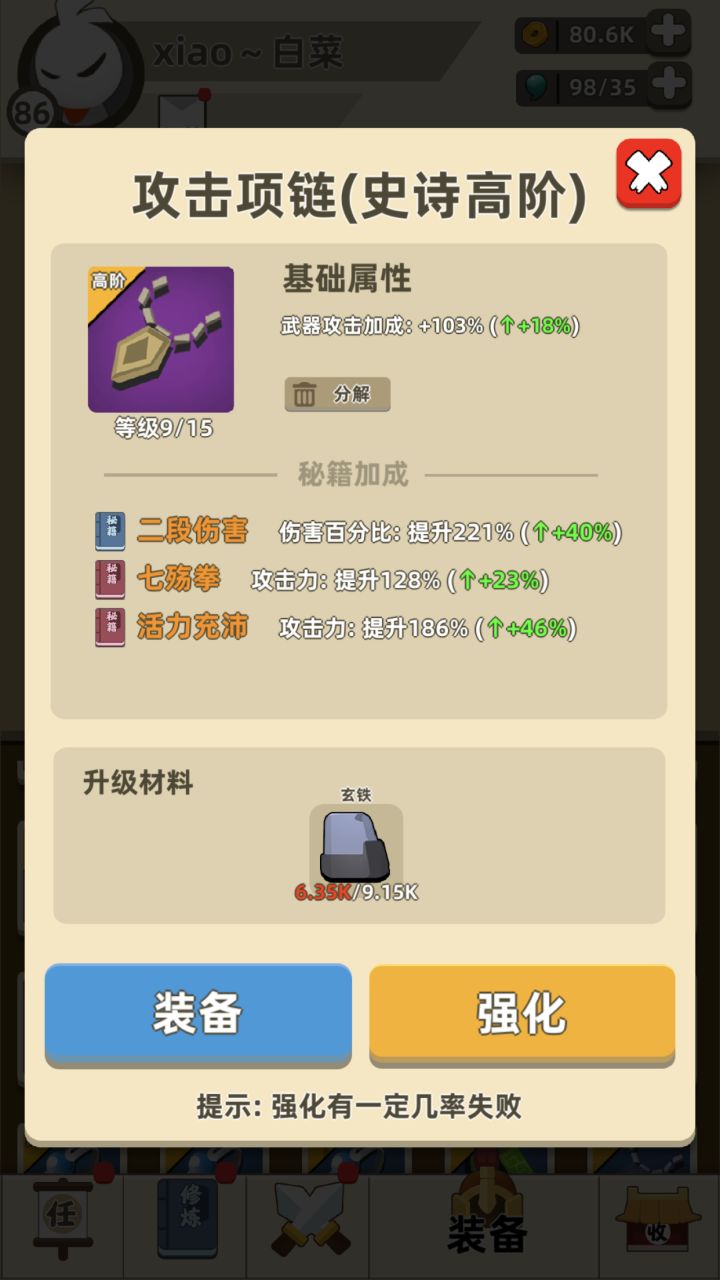 这两个首饰强化一共用600左右玄铁,我脸黑到现在都没用满级,刷了好久才弄到两个属性效果特别好的,大家升级饰品的时候,一定要看好饰品的效果在升级,比如第一张图虽然加攻击力,但效果太鸡肋了,建议大家这样的饰品不要去升级,不然打到后面很难玩的。