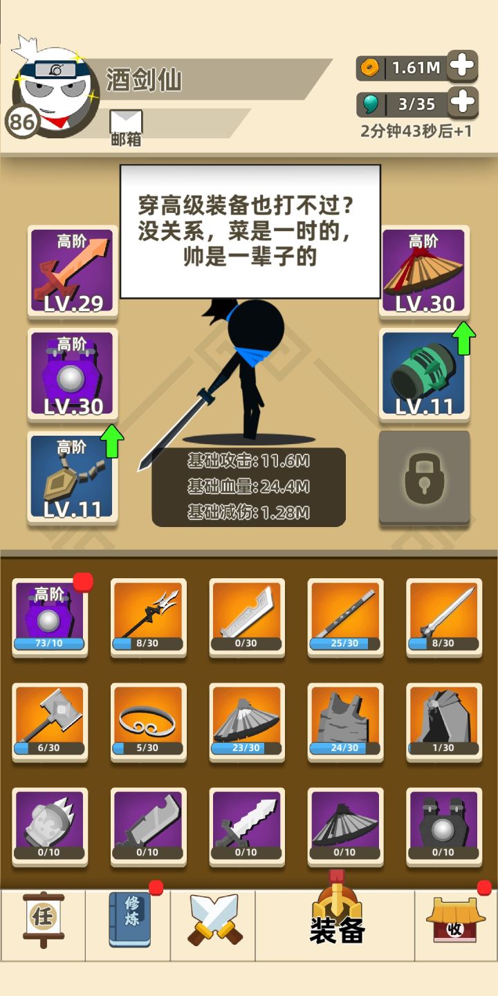 写个简略的感想吧。钱: 首先钱留着升级内功,装备可以先等着,因为后面没打过一关回换,钱多了再升装备。关卡:里面选秘籍首选加攻击力的,死亡一指(看脸),暴击,再加一个吸血,然后可以加排山倒海清怪(我反正是这么来的😁)。金钟罩,加血,还有什么的,自己觉得需要就拿吧。这里我没有说组合秘籍的,因为打到了那里,你自己也知道啥秘籍牛逼了( ˃̶̤́ ꒳ ˂̶̤̀ )装备:优先选后面关卡的装备,剑、刀、拳