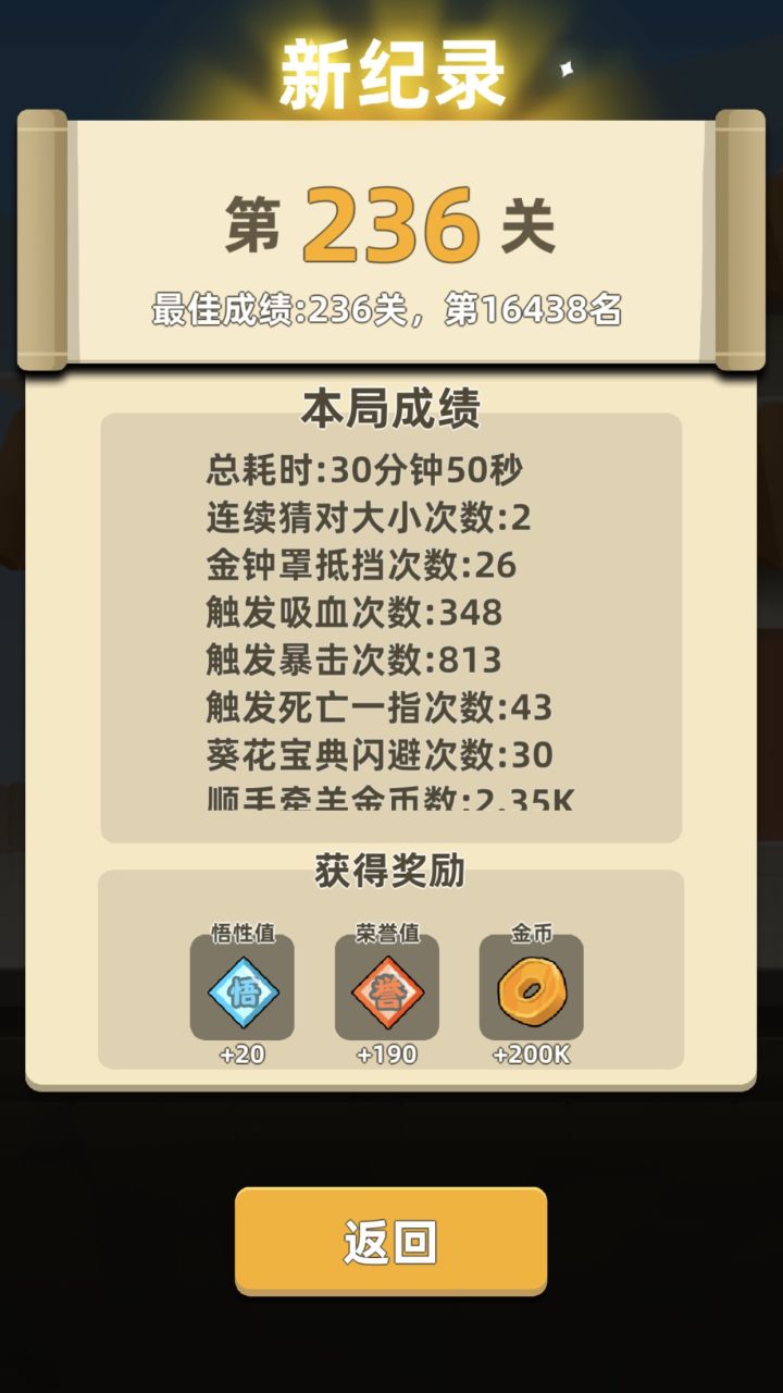 上篇帖子我简要说了一下如何在操作有限的情况下通过匈奴。最近一直没发帖是因为一直在肝天山。今天天山已通特来和大家分享一下。话不多说。先上图。这是本人的装备截图和属性截图。这个属性下通天山基本就不需要太多极限操作了。只需要简单的日常操作就可以通关。本次通关实际用了两条命。第一条就是大圣衣服的被动被触发了。第二就是浩然正气也被触发了。后面怪伤害极高。基本都有大动脉能力。看广告的复活并未使用。由于时间关