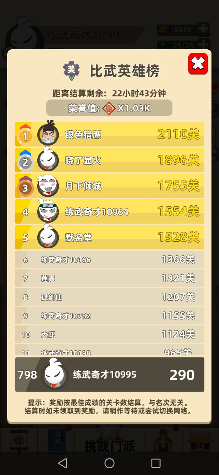 游戏前期的内功和武器加上玩家自己操作是很有挑战感的,每次通完关点两三个攻击内功,就可以去挑战下一关,很有成就感。但是,游戏玩到后面慢慢发现,就算你修炼满所有内功都打不过下一个关卡,然后去升级武器,慢慢养成武器的过程需要的时间,如果你仔细算一下的话,那可能会吓你一跳。所以就别欺骗自己说什么养成了。我们大部分玩家也是很努力的,小部分大佬是真的牛逼,手不残不说,还写攻略,也是辛苦了,或许只有小部分大