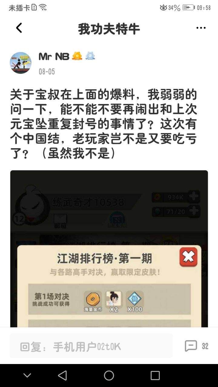 活动开始我就觉得有可能会和上一次一样元宝重复封号的事,结果还真出来了。这是官3群里的一个人,也是重复被封号了,可能年前还有很多活动,希望官方能调查一下并解除封号。
