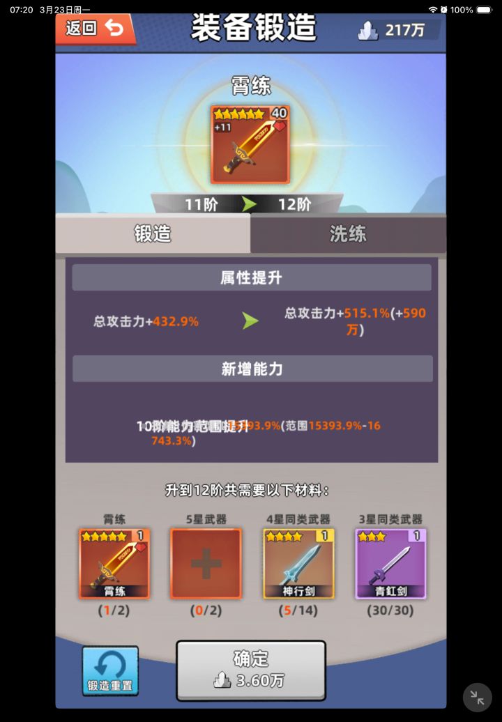 霄练锻11,鞋子锻8了今日进度:10630关
