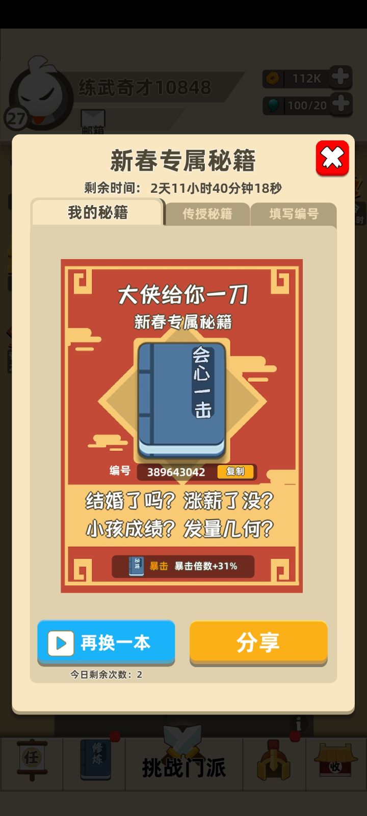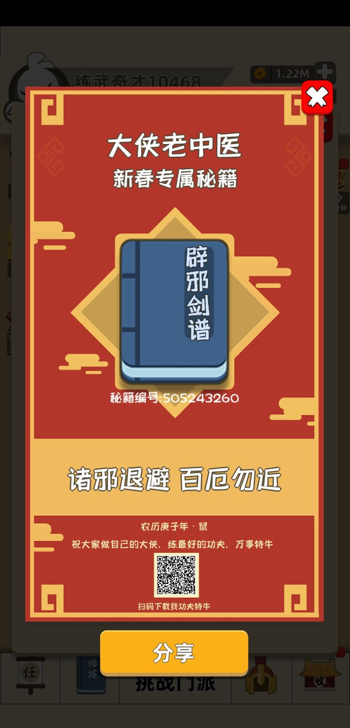 我功夫特牛大侠版本0.1.34已经全面更新安卓可扫描此贴中二维码,或者到群文件下载更新。IOS到手机商店下载更新。祝大家节日快乐!