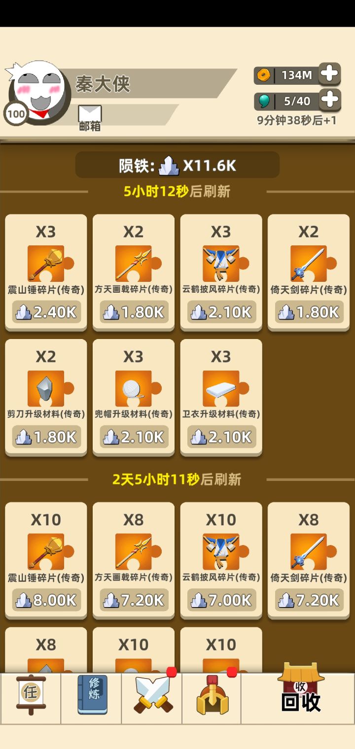肝完了370体力刷了70M,20多K陨铁,屠龙差几个