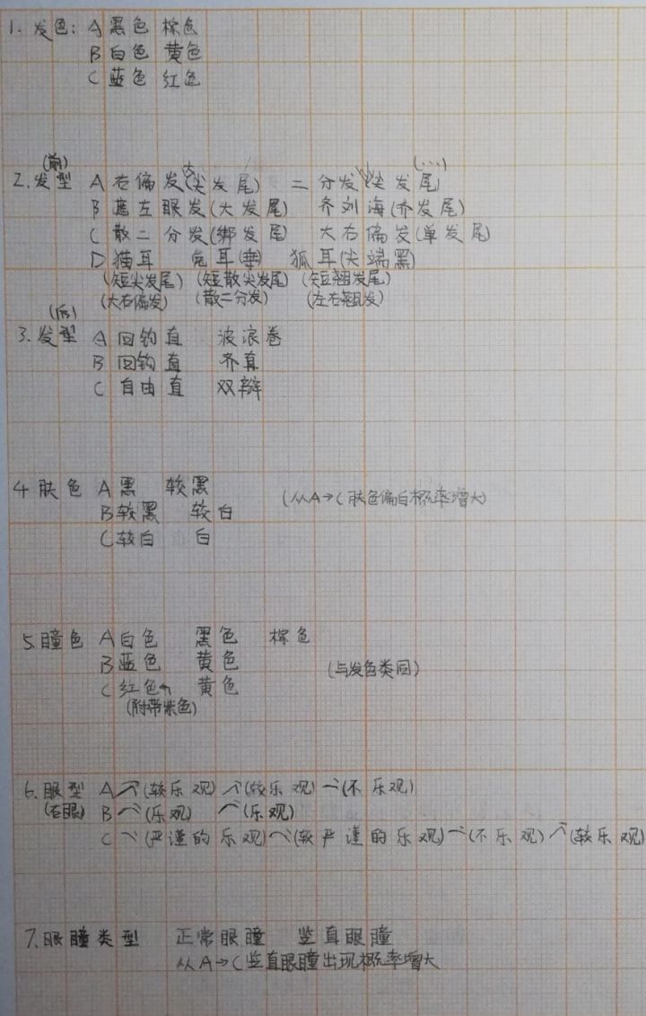 问题1控制发色:A 茶色或黑色;B 白色或绿色;C 蓝色或红色问题2控制前发:A 中分或斜刘海;B 侧分遮眼或带发饰的齐刘海;C 双辫或单辫;D 猫耳或犬耳或狼耳问题3控制后发:A 卷发或内扣直发(长);B 内扣直发(短)或直发;C 外扣发尾或低双马尾问题4控制肤色:A 粉二白或粉三白或粉四白;B 黄一白或粉三白;C 黄一白或粉一白或粉二白*图上就是黄一白/粉一白/粉二白/粉三白/粉四白*