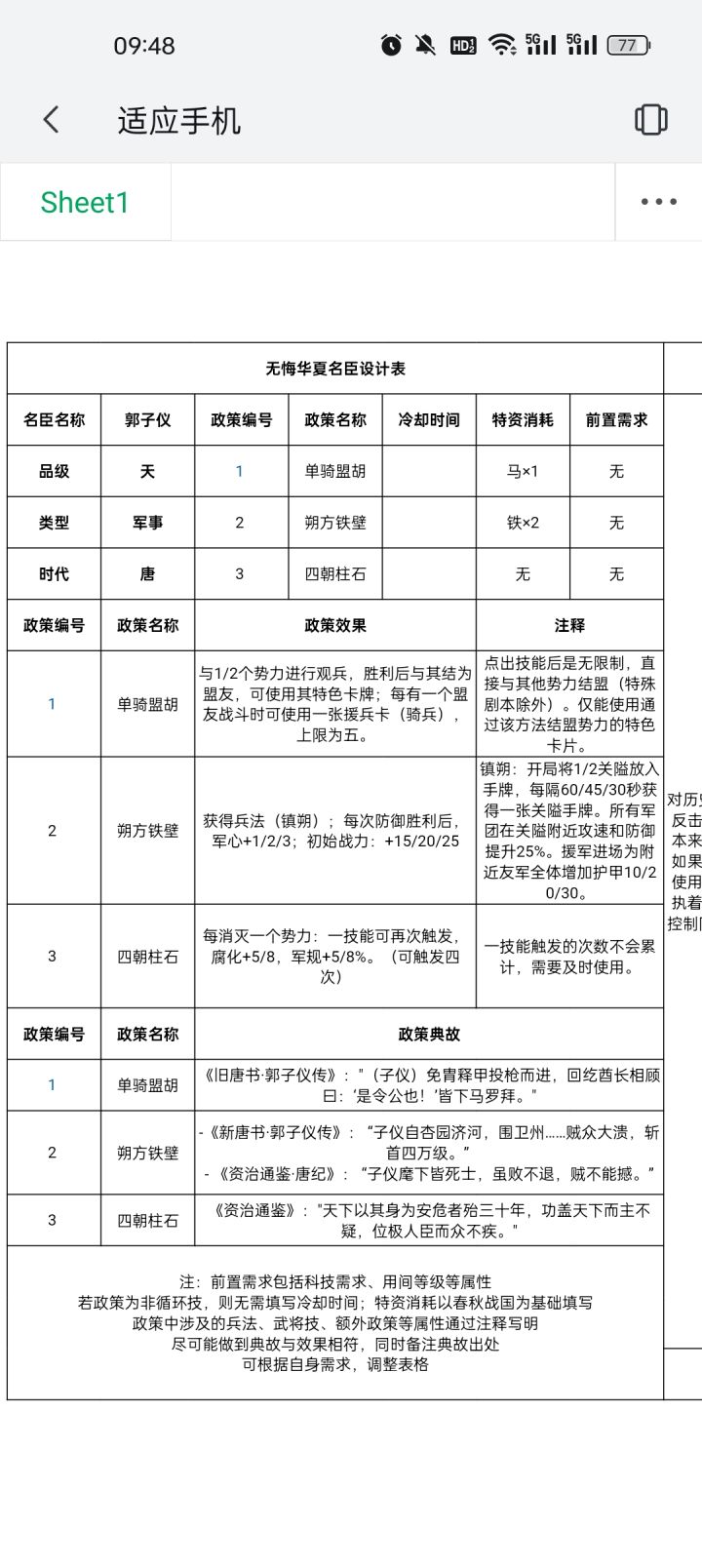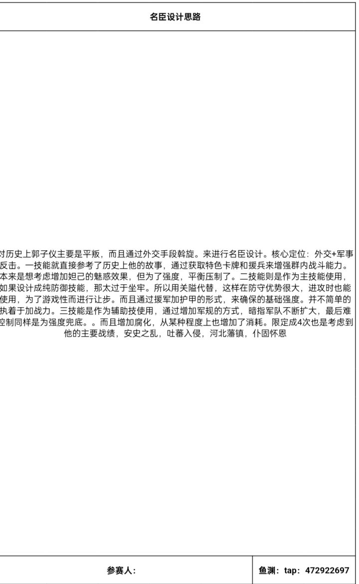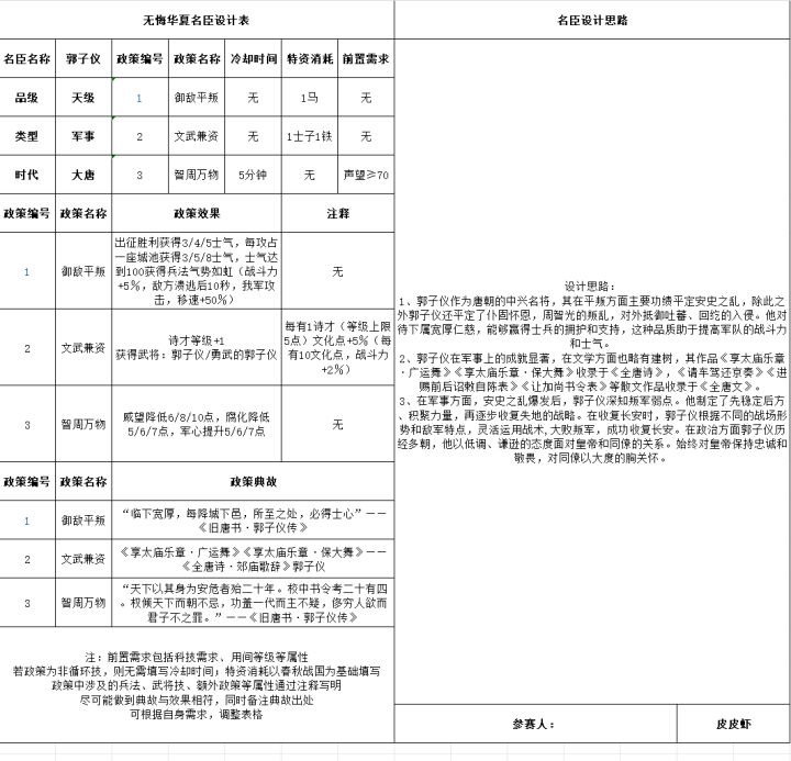 #无悔华夏名臣设计大赛 对历史上郭子仪主要是平叛,而且通过外交手段斡旋。来进行名臣设计。核心定位:外交+军事反击。一技能就直接参考了历史上他的故事,通过获取特色卡牌和援兵来增强局内战斗能力。本来是想考虑增加妲己的魅惑招降效果,但为了强度,平衡压制了。二技能则是作为主技能使用,如果设计成纯防御技能,那太过于坐牢。所以用关隘代替,这样在防守优势很大,进攻时也能使用,为了游戏性而进行让步。而且通