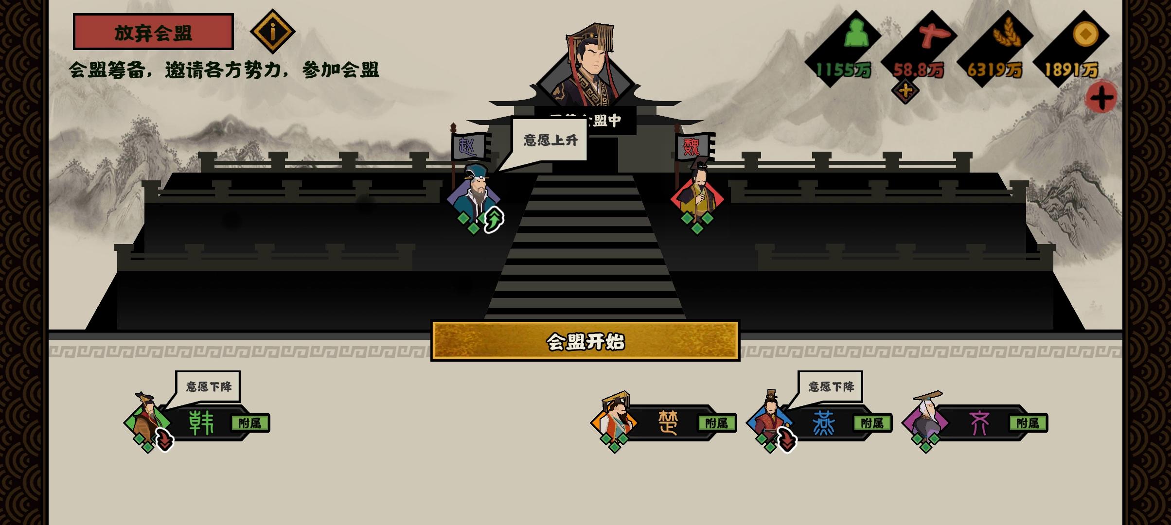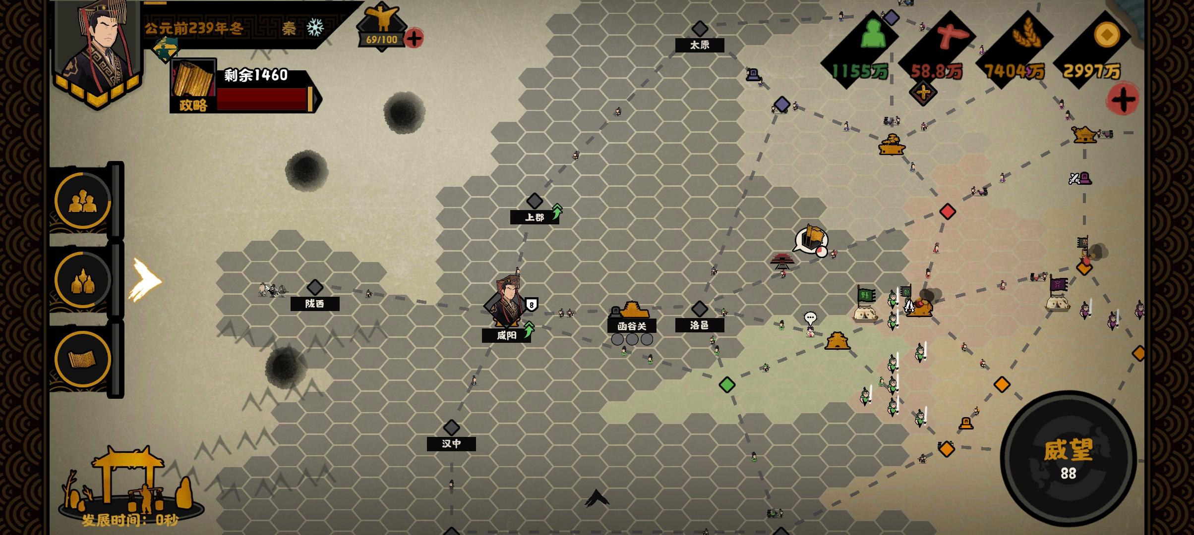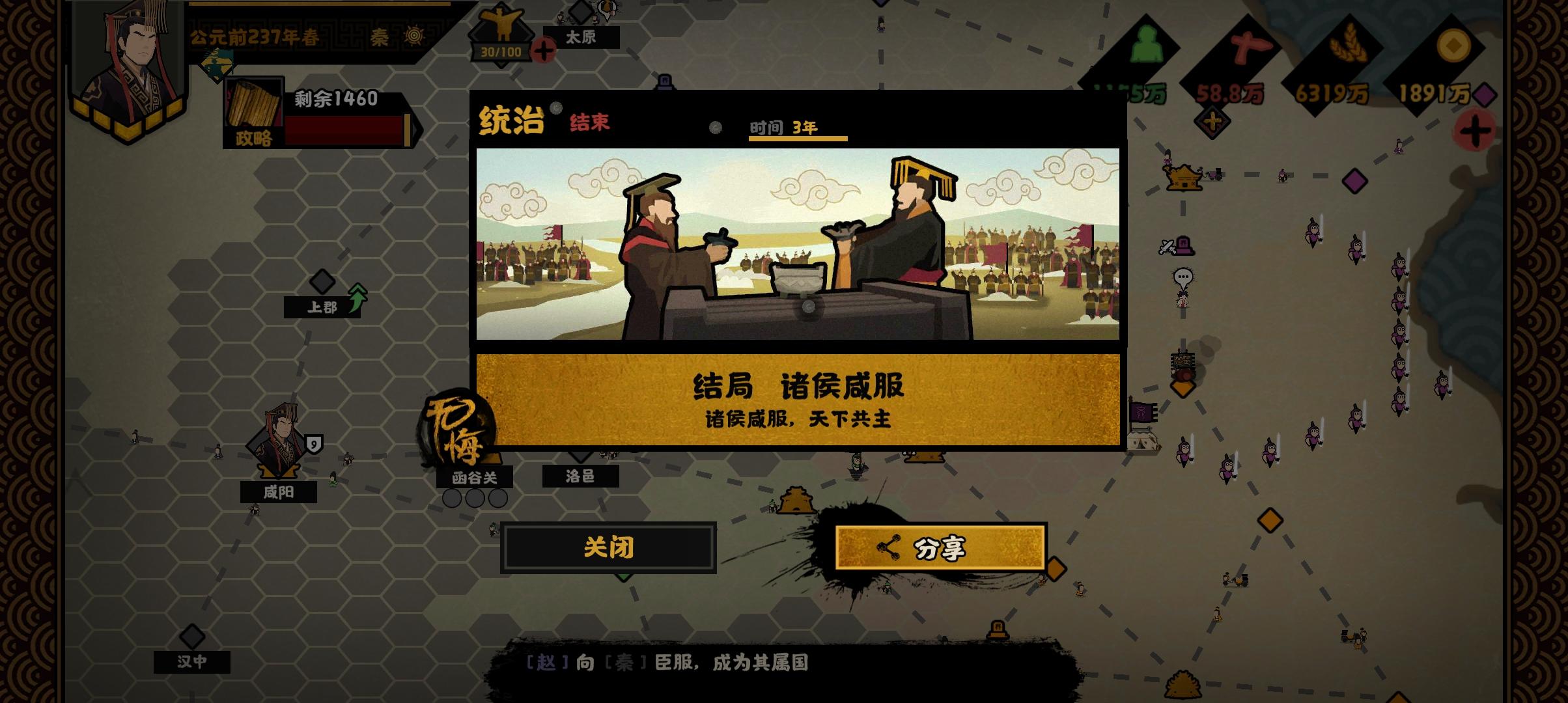 我1民心1军心99腐化打了一个威,然后满条件打了一个威,然后试着让秦灭义渠,但是满民心军心,30腐化结果不是威(除了义渠被秦灭了,其他都是我灭的