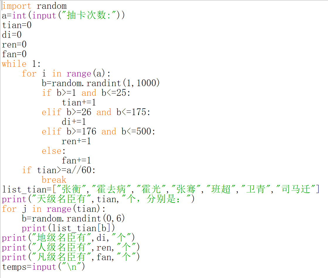 大汉版本是9月15日上线,而我在等待大汉的这段时间里百无聊赖,只能默默地攒着笔和玄玉,看到论坛里攒了三四百抽的大佬,只攒了两百抽的我只能默默羡慕。但有时候我也会想:攒这么多抽真的有必要吗?我如果要在大汉版本上线的第一天抽到全名臣要多少抽呢?虽然抽卡这件事跟个人的运气相关,得到一个确切的数字并不容易,但是我们可以用计算机来模拟抽卡。在这里我使用了Python来编写程序,概率来自游戏内数据,喜欢的话希