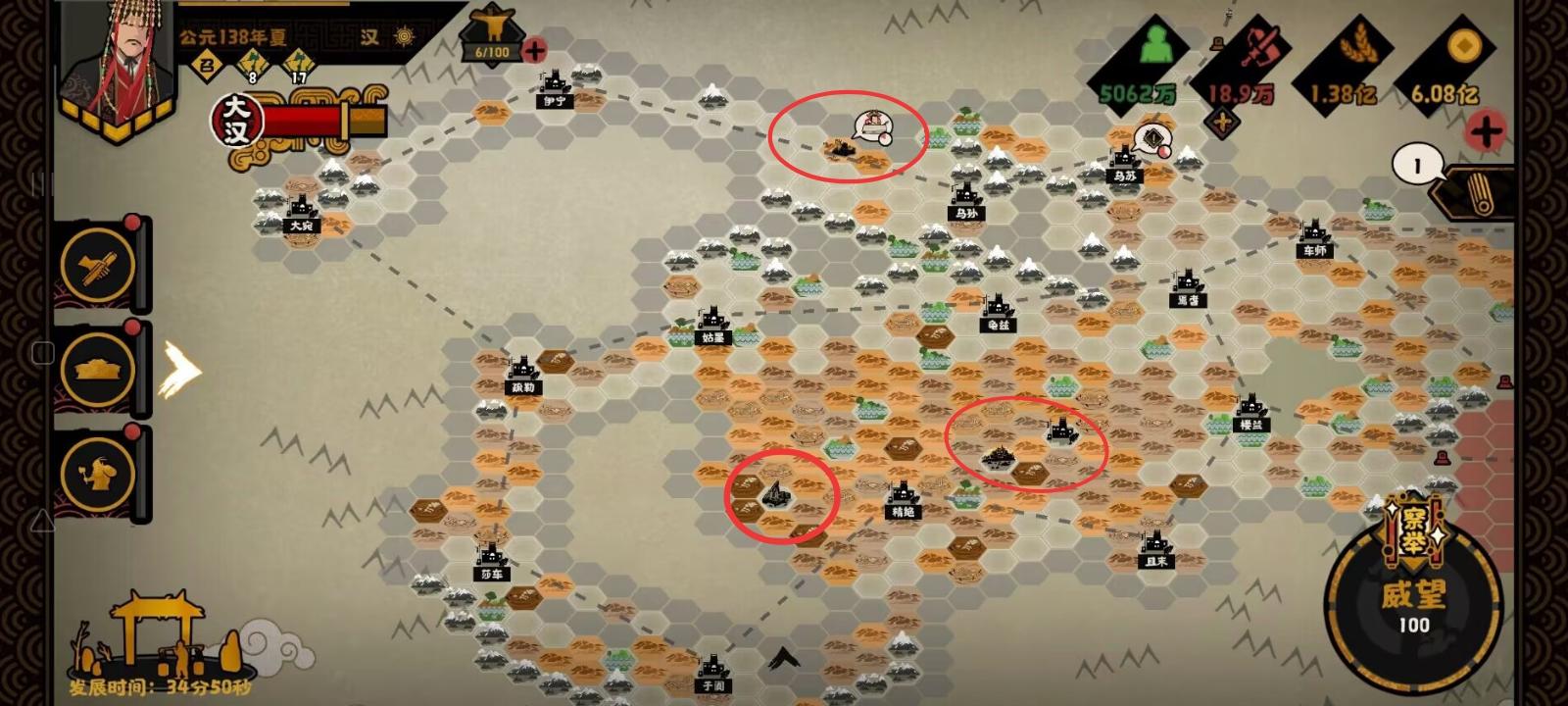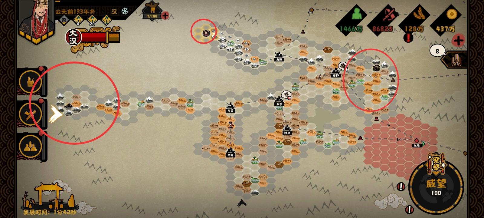 我这把就是在前期通过伟大的赵王刷威望然后疯狂sl会盟刷出攻伐 然后拉匈奴夜郎打南岳 这样夜郎的三个香料还有白城敦煌就可以开了 之后慢慢和亲(我是挑战)期间疯狂探索西域 但别开太多西域城邦 因为巨婴太多 而且期间要打匈奴 那时候匈奴buff可能还没有降多少层 损兵损粮钱掉影响力 就优先降匈奴buff 在还剩一两层的时候开打 而且我带的是羲和 霍去病 商鞅 庄子 在跟匈奴开战前先灭南越加军心 留夜郎9