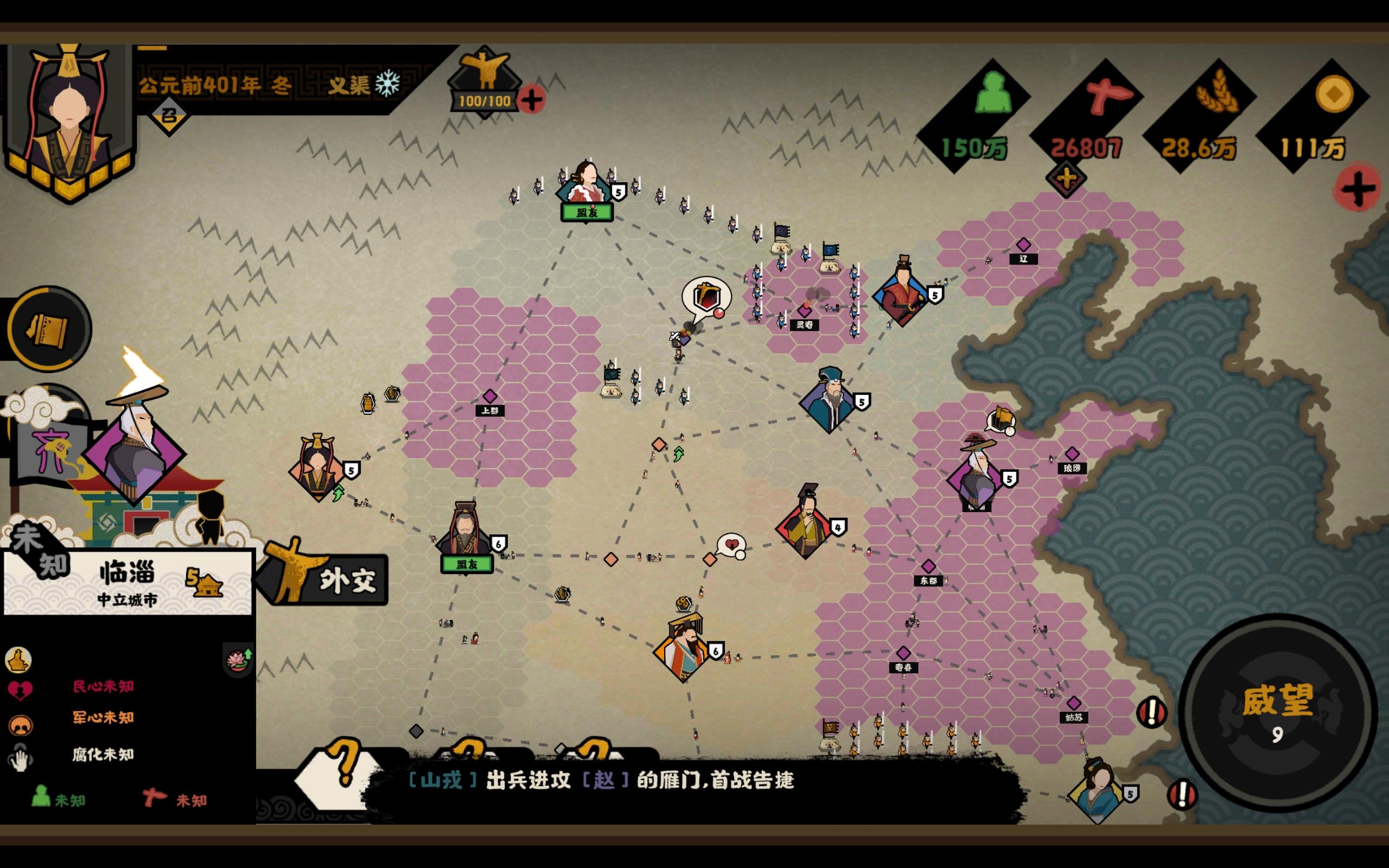 在下关山月,与诸君相逢,愿如钟期,不能奏一曲流水相送,但献上一点浅见,望有所裨益。对于挑战模式,我们可以选择最强的【商】进行对局。其他势力战斗力加成15%其他势力不会轻敌: 开启后,其他势力始终全力以赴;解读:意味着AI战斗力在前中期是远高于你的,无法通过战力碾压完成对局。其他势力初始政策:0解读:AI不会开局升三级兵,此攻略就是抓住这个机会。野心势力:开启后,会盟或共伐频率提升;解