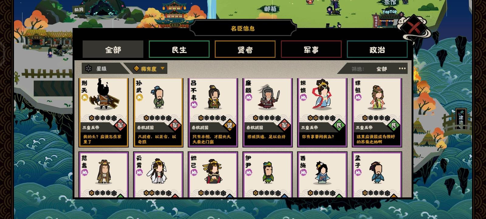 大家好这里是奕玖。本次更新大大加强了名臣的强度,给了每个名臣相应的前期属性并且除了装备和等级,名臣自身的星数也极大影响了技能。由于部分金色名臣是可以通过招募获得的并且技能也需要星数解锁,恰好通关游戏可以给名臣碎片,所以在无法通过抽卡来升星的情况下速通便是解放钱包的唯一出路,因此本次攻略以速通三皇五帝时代为突破口。优点简单粗暴有手就行缺点前期得探索等待半天。首先名臣方面三皇五帝时代要求不高,注意别