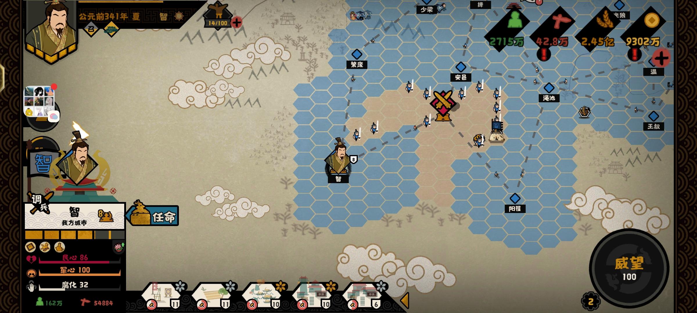 巴青,李斯,张良,妇好的组合打春秋真好使。就是得早点点出户籍要不行动力不足不好刷好感度。政策方面军点虎符战鼓就行。后期出星级兵。出不出的吧。全程对面只有1.5w到1.65w的兵。自己开局到2.4w后期轻松到3.6w。军事只点了虎符和战鼓。规模流属实好用。