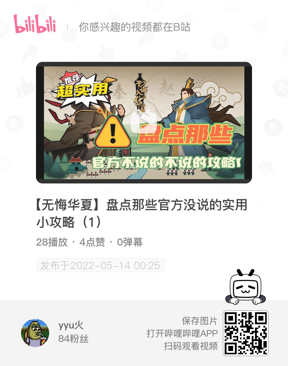 刚做的视频,觉得有用的话希望多多点赞支持下,感谢!【无悔华夏】盘点那些官方没说的实用小攻略(1)-哔哩哔哩】 https://b23.tv/Pui2a21