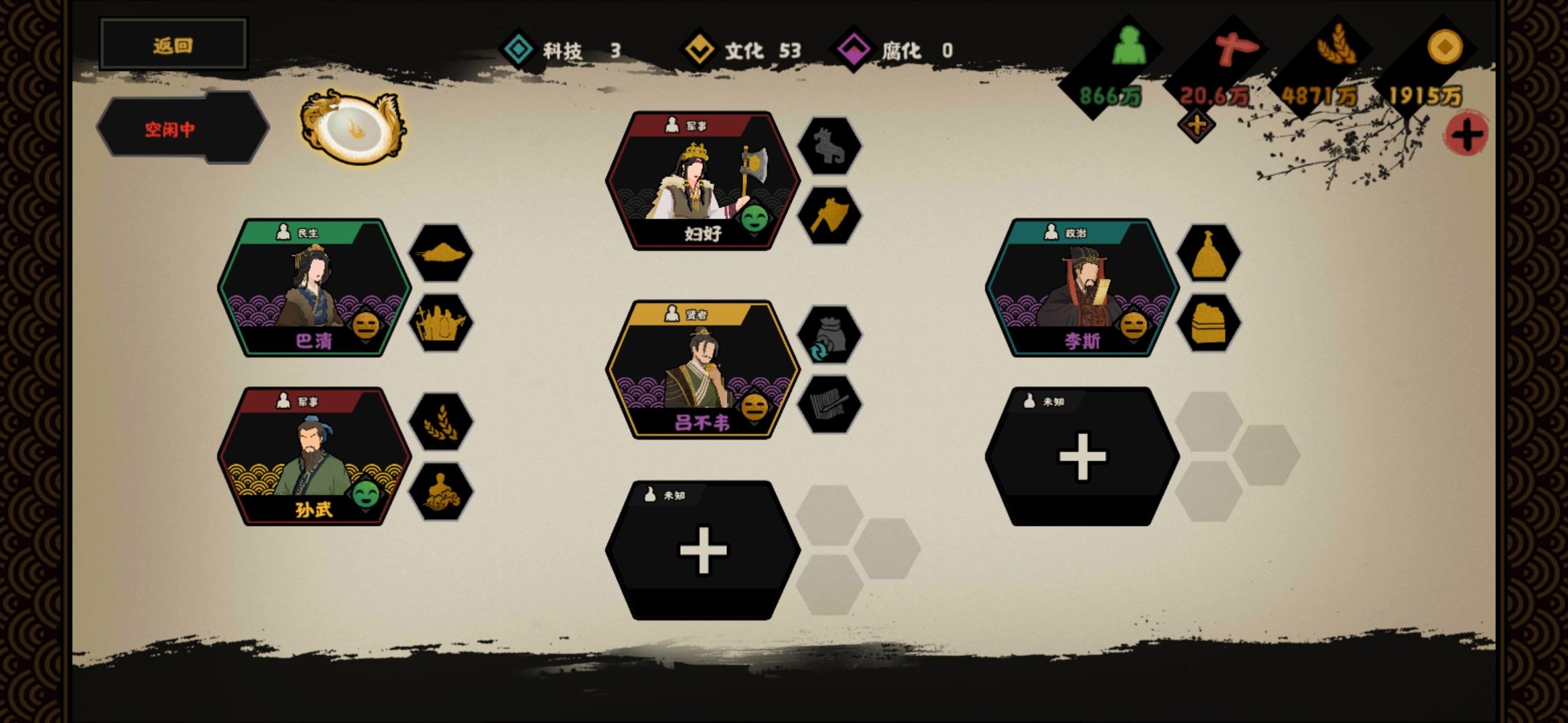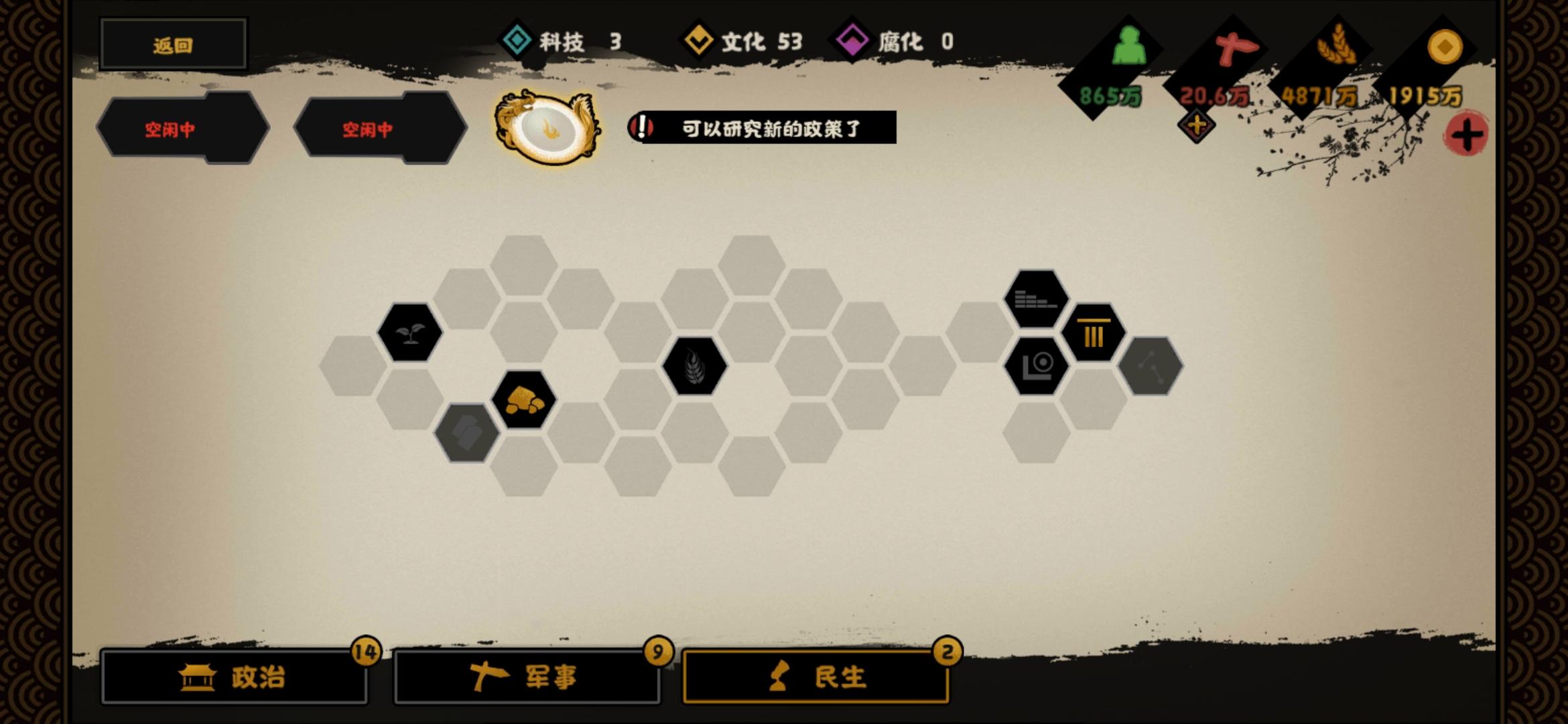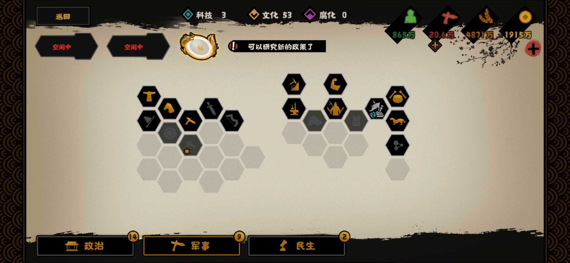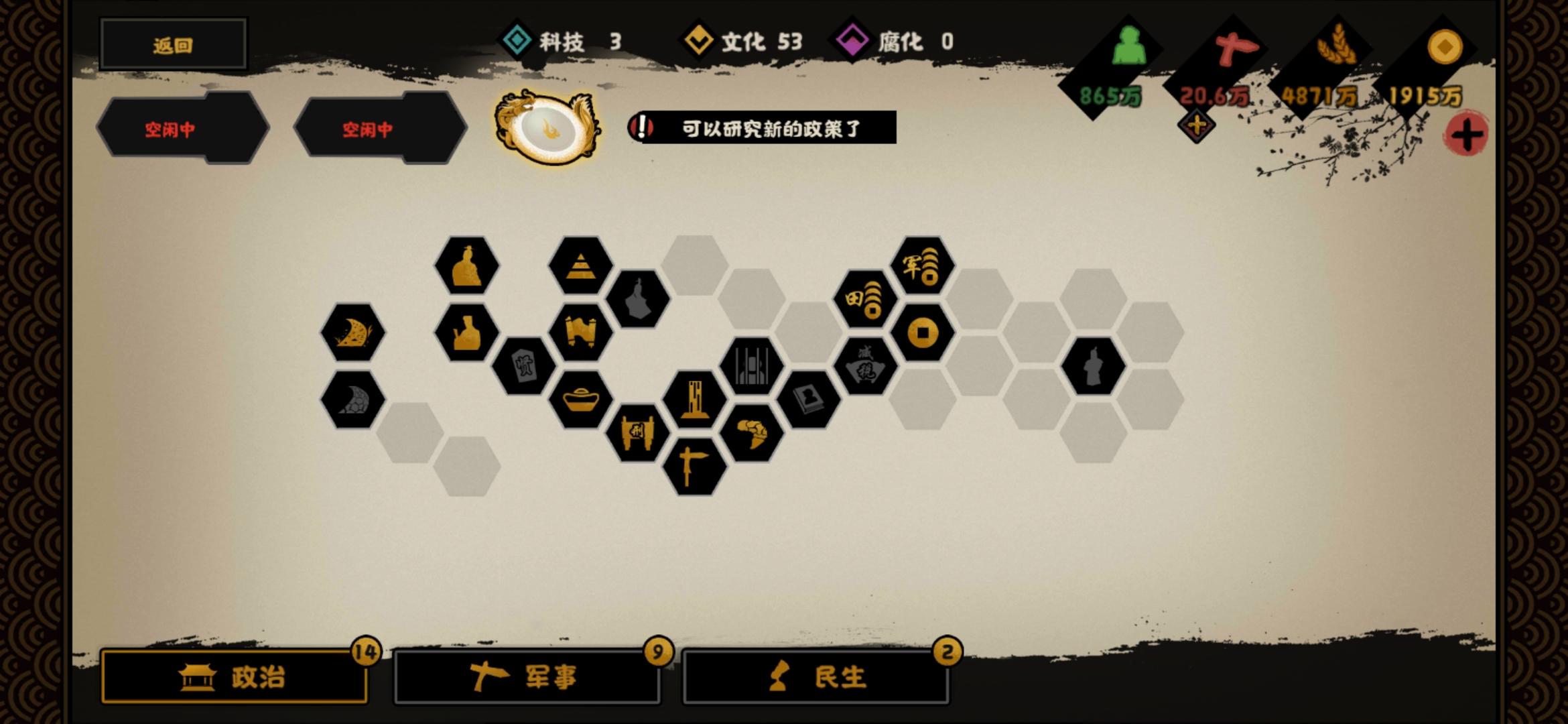 灭国结局很容易,带陈平就行了。但存活结局不容易,有些玩家经常刷各个国家的存活结局。存活往往需要用到速推。速推的政策虽然一模一样,但各国的开局贸易、特殊资源情况不一样。所以了解我们各国特殊资源和好感度情况,方便我们快速贸易需要的特殊资源叠军规。甚至点出某些需要特殊资源的名臣政策,像管仲要3个士子的尊王攘夷,商鞅要三个铁矿石加战斗力的一技能。政策路线:军*行书(10%军规)、训教政治*律法—