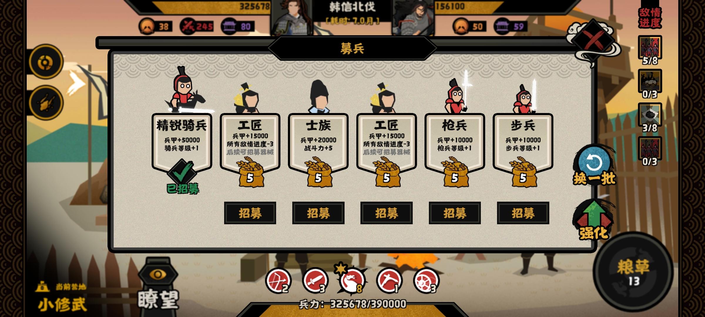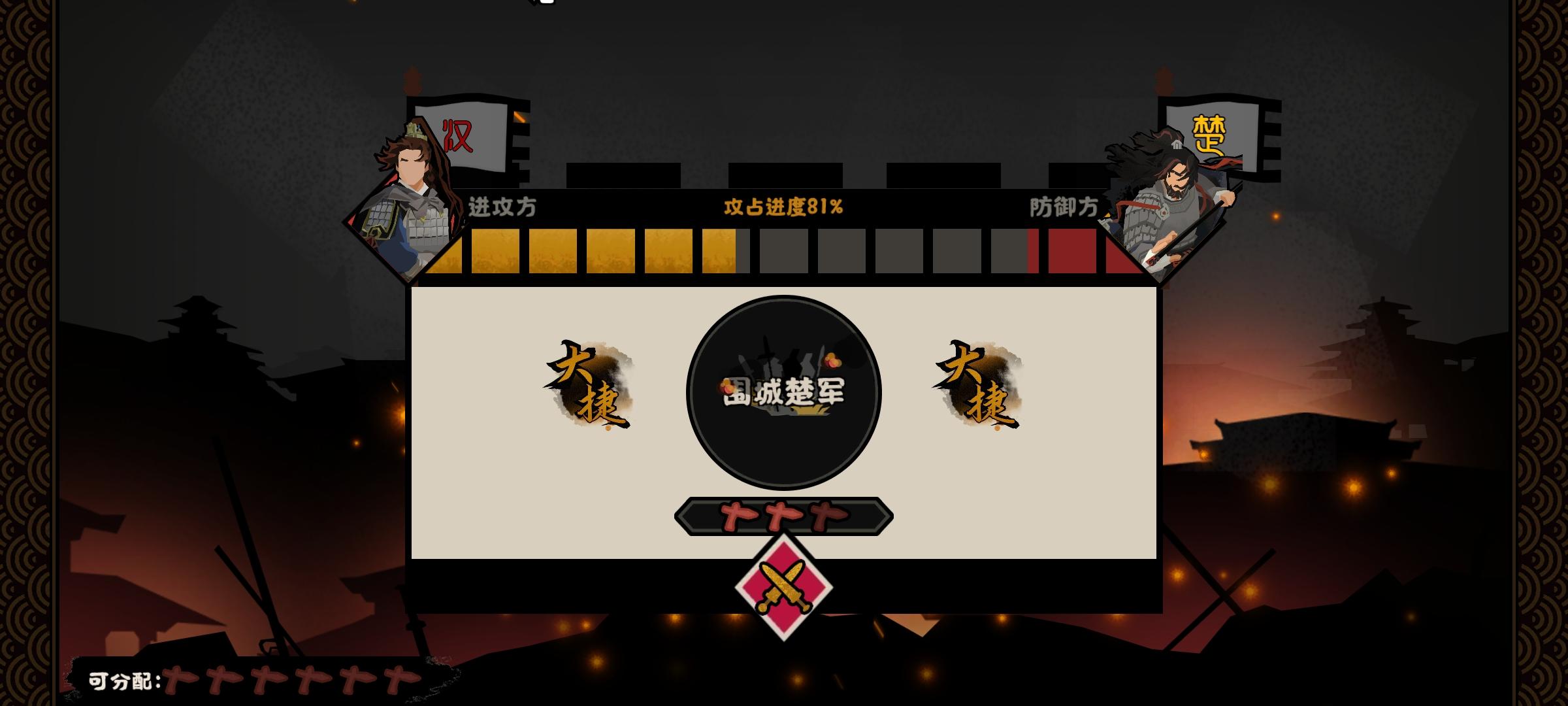 三小时完成韩信北伐,继涿鹿和长平第一次没有康攻略自通三星,略有心得,分享一下。首先还是单升一个兵种,这里我选择的是车兵,还是很舒服的,走隐士路,三级和六级加100点护甲。北伐城市大多都是平原,还自带骑兵,玩车兵体系,见到弓箭手就开心舒服哈哈。看城市数量点每次到营地加粮草的选项,有资源可以玩玩用间(并没有太大效益)后期保持六万兵力即可,把上限升到8级25w的样子,保证刘邦10点以上状态,加70%兵