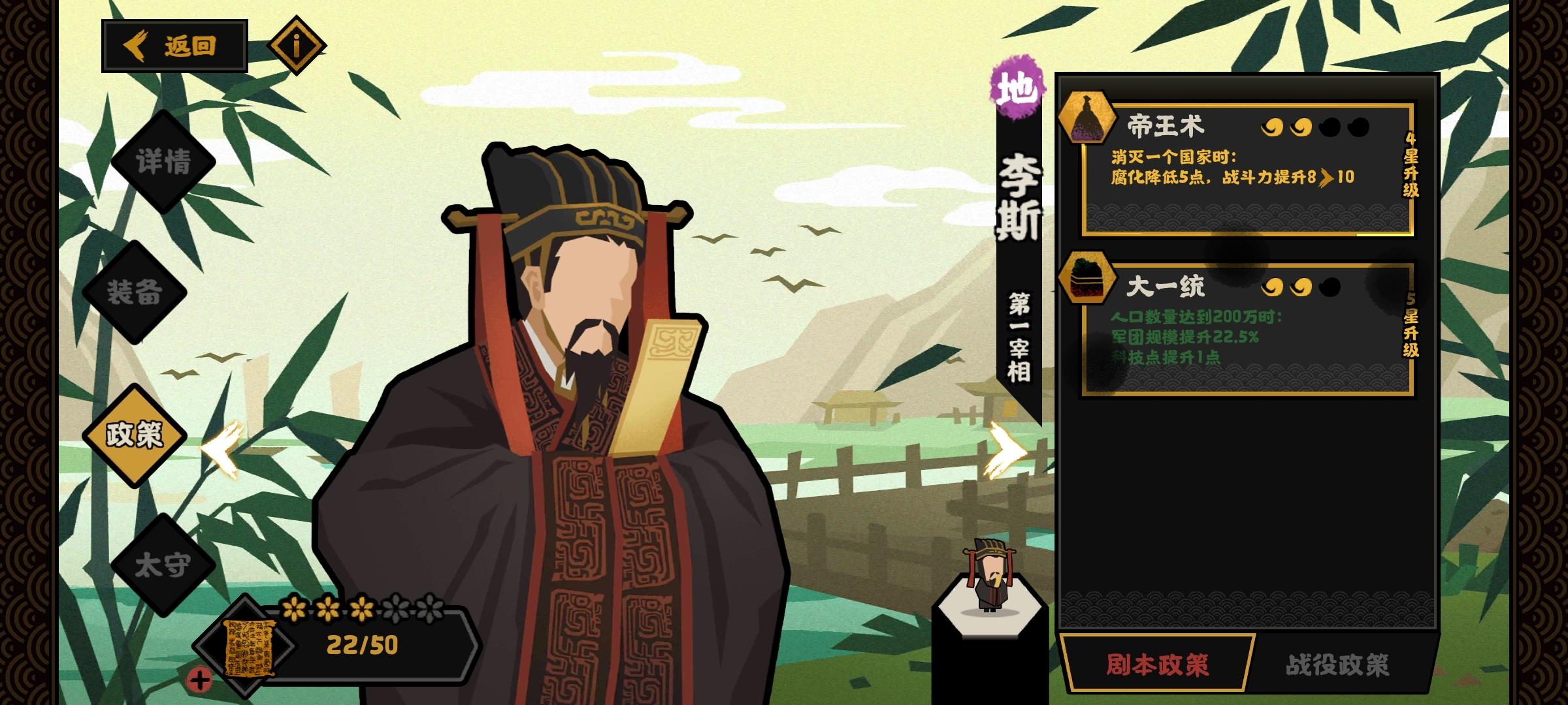 在之前的内测中,紫卡中实际上能用到的卡牌较少,可以说只有张仪等几张卡。因此在最后的更新测试,也就是加入秦楚汉后,出现了其他几张非常好用的紫卡,而这篇我们要讲的是李斯。李斯的设定最初是秦楚汉卡包,但是目前春秋战国卡包也可以抽到。很多人对于李斯的设定并不明确,认为这张卡的作用很低,那么我们来看一看李斯的技能。帝王术最大的特性就是国家越多,李斯的加成越高。每消灭一个国家可以提高可观的战斗力,并且固定