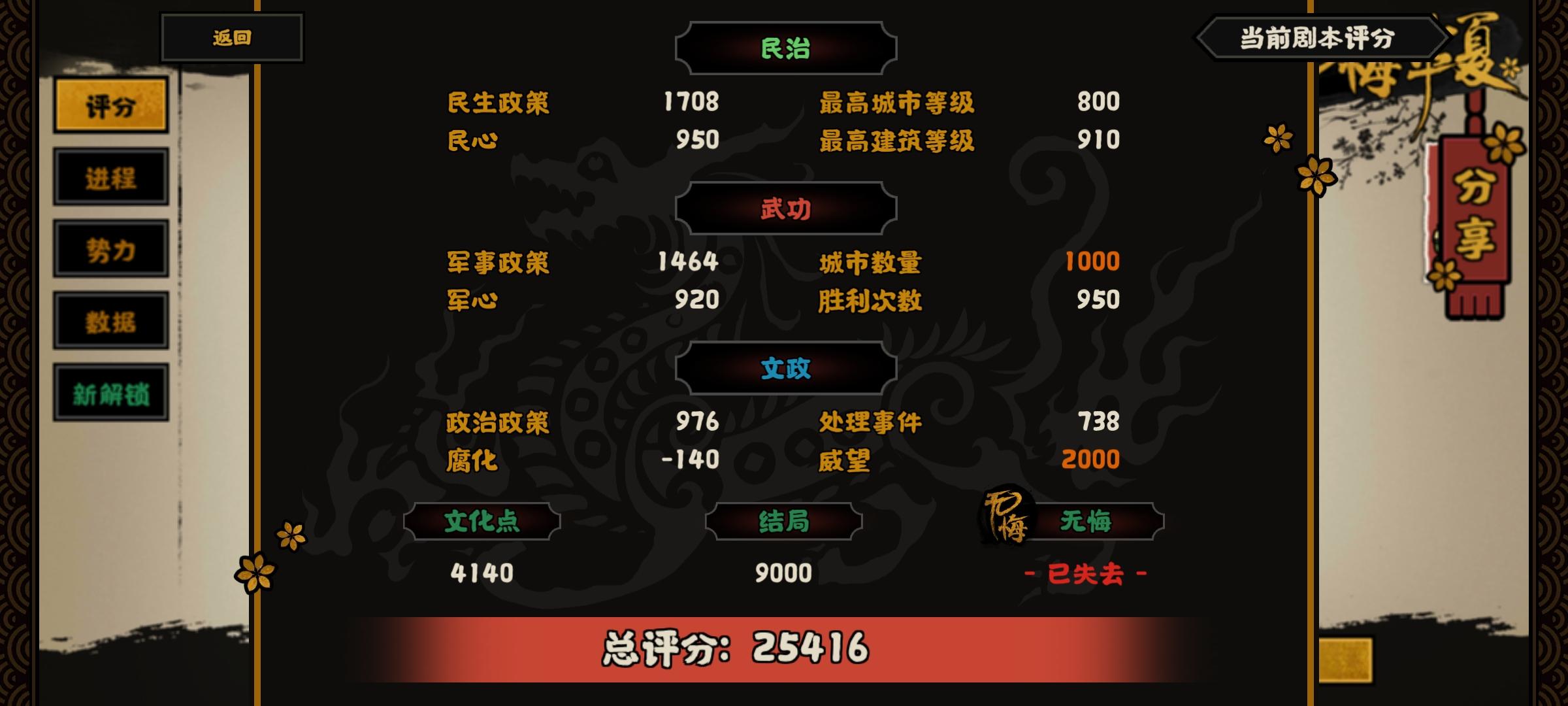 地图:三皇五帝(这个的确打的快)出场名臣:随意(完全不点技能,因为是带着刷碎片的,星级和等级都很低)开局:北狄(野兽打架最快)流程:1.统一(不带女艾实测半个小时)1.1科技只点加战力和规模的政策,其他都别点,建筑也别升级,强盗也不用打1.2祭祀只祭祀第一个,拿威望(运气好的话灭神农前能搞一次会盟)1.3攻城对同一个城市连续两次探索。从上往下直接打四个国家,不做多余操作,留右下