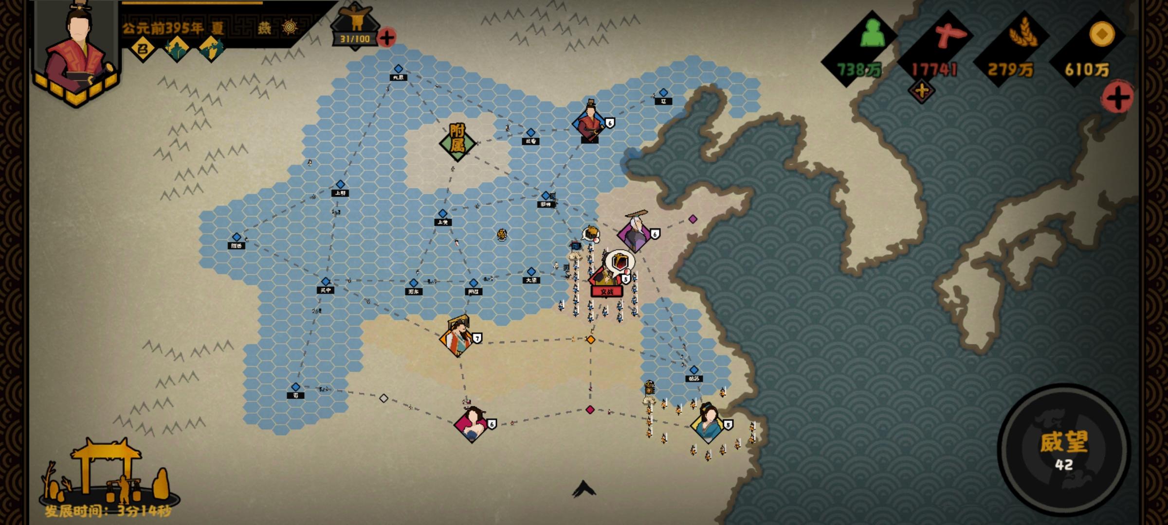 之后个人建议打秦国(小技巧,打哪个城市,前中期尽量吧部队调到最近的城市,减少开销。)