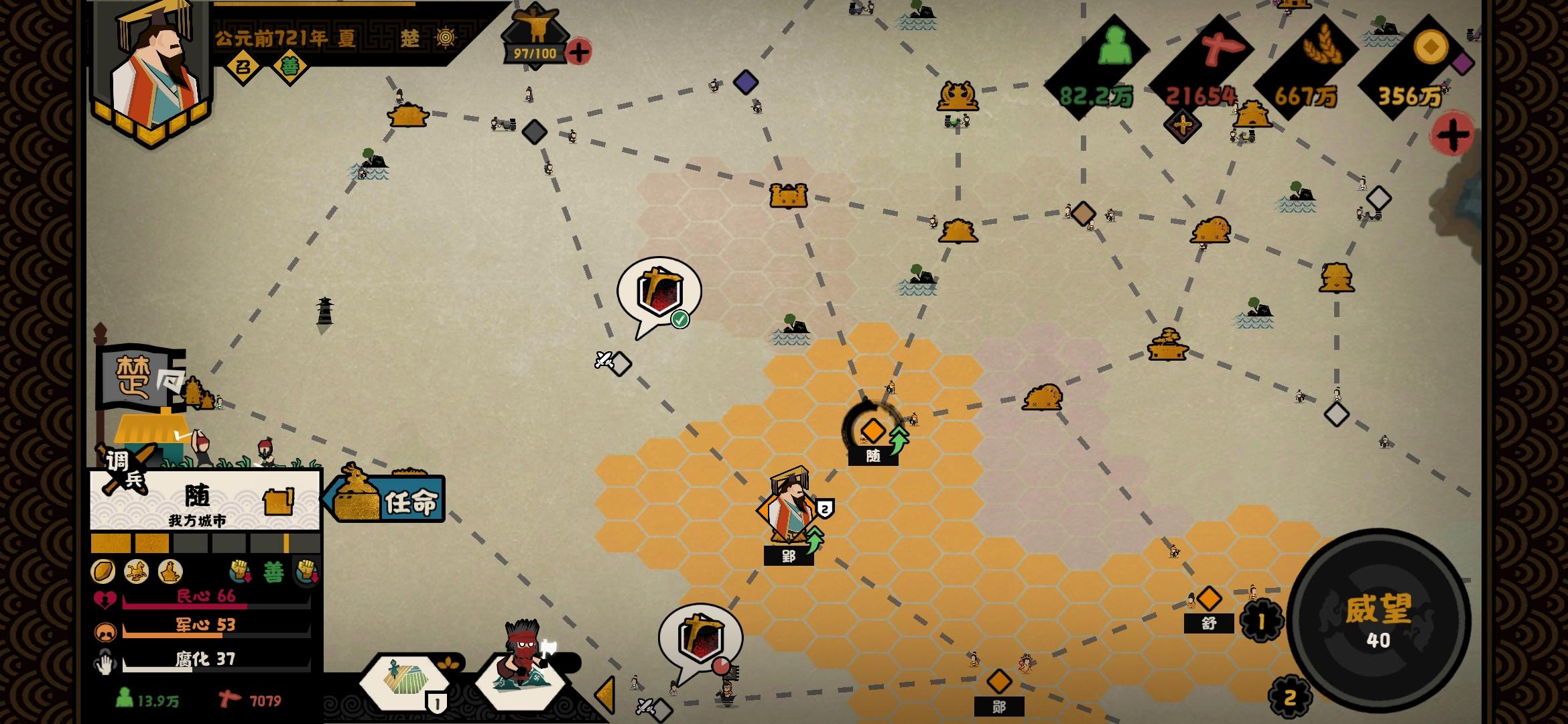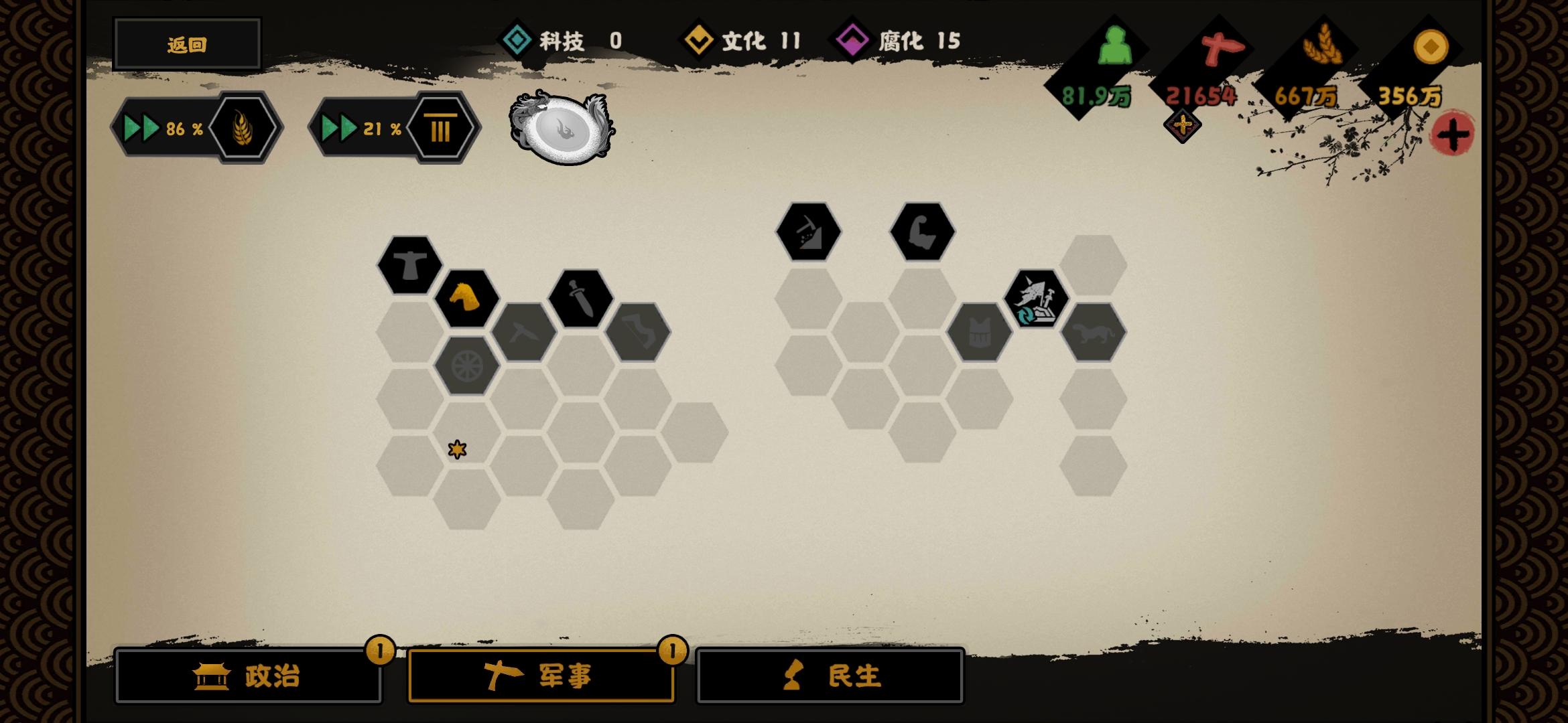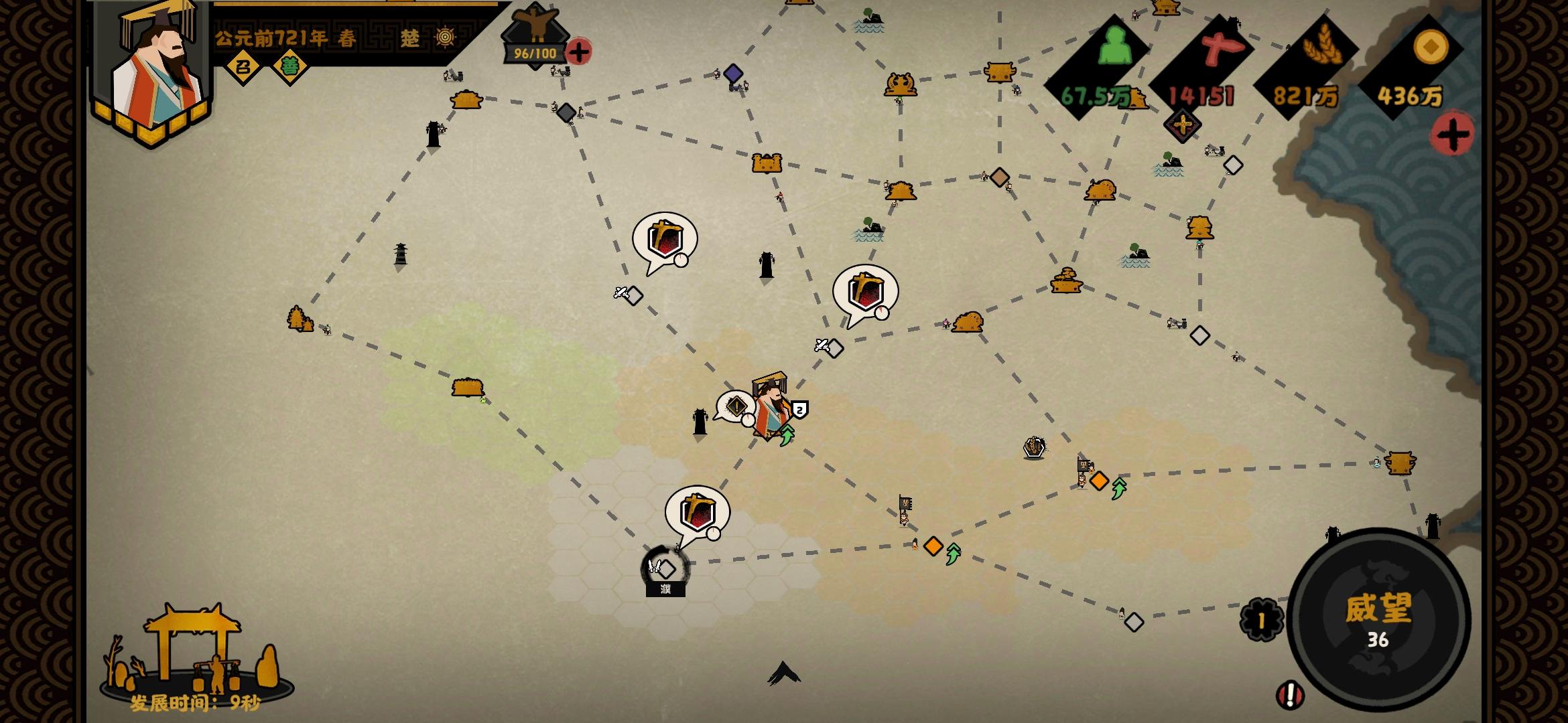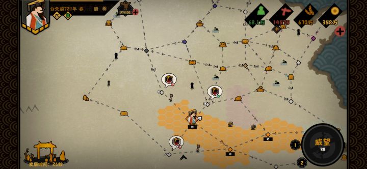 开局势力选择:轩辕开局名臣选择:能加战力的随便选选就行 推荐人手都有的 刑天 建议政治和贤者名臣拥有可以自转的技能 就是使用一次后可以再次研究使用的技能 来提升好感 民生名臣随意因为一定会满好感进入游戏后政策将加战力的点出来★重点★「开始征兵全局征兵6~7次即可」因为前期征兵很便宜 可以征兵就点击征兵★重点★随后开始往上方北狄和下方神农同时进行探索 推进 沿着下面图片的路线探索和消灭这两