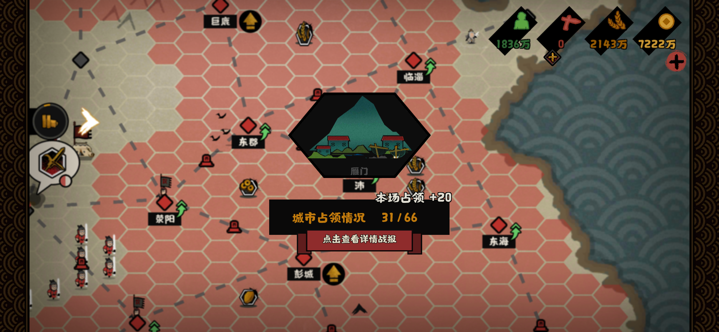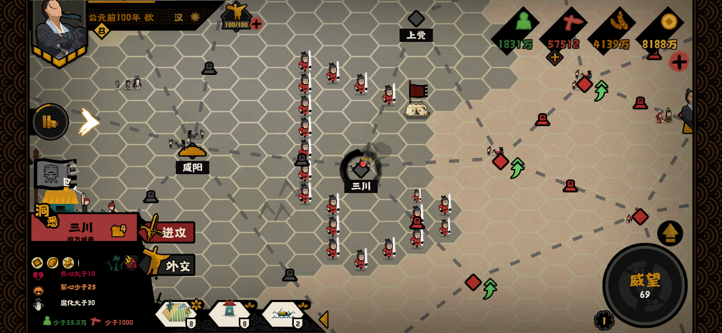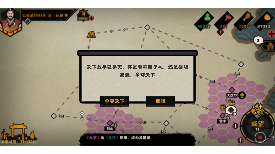 三皇五帝平民玩家快速统一先放结局:三星必备名臣:女艾人级名臣,基本上人人都有核心技能:谍报:所有城市信息度+50%有了它,就可以直接打野,不需要先探索看下图:我把所有中立城市全部占领了,其他势力还是只有一个城市(出了轩辕上面的没有路,被他占领了)。基本上就一路杀下去,军心一直100。然后需要用一个物资车保证政策能快速执行,外交上紧急募兵一下保证兵甲充足攻城,方略的话就选择增加兵甲就行