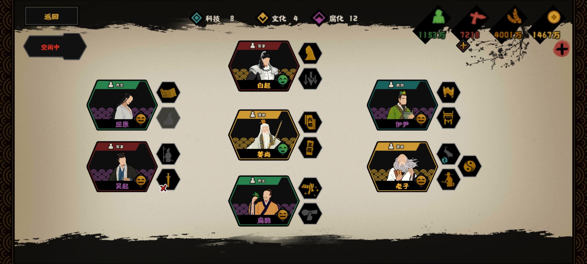 开局带个张良和妲己,一个加小弟的好感一个加威望快速开会,民生和军事随便带个用着顺手的。