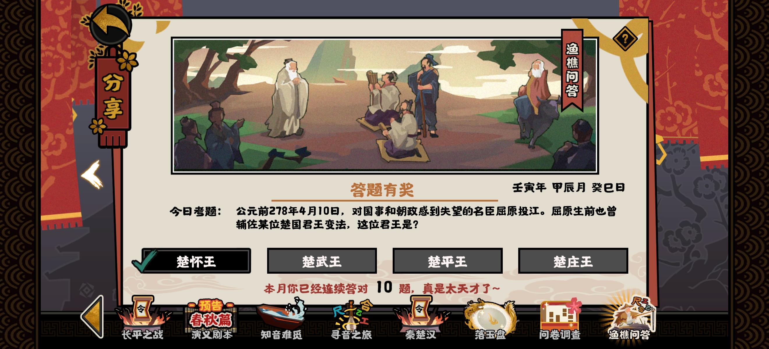 4月10今日份渔樵问答楚怀王约周慎靓王四年(前317年),屈原担任楚怀王左徒,从事变法改革,制订并出台各种法令。