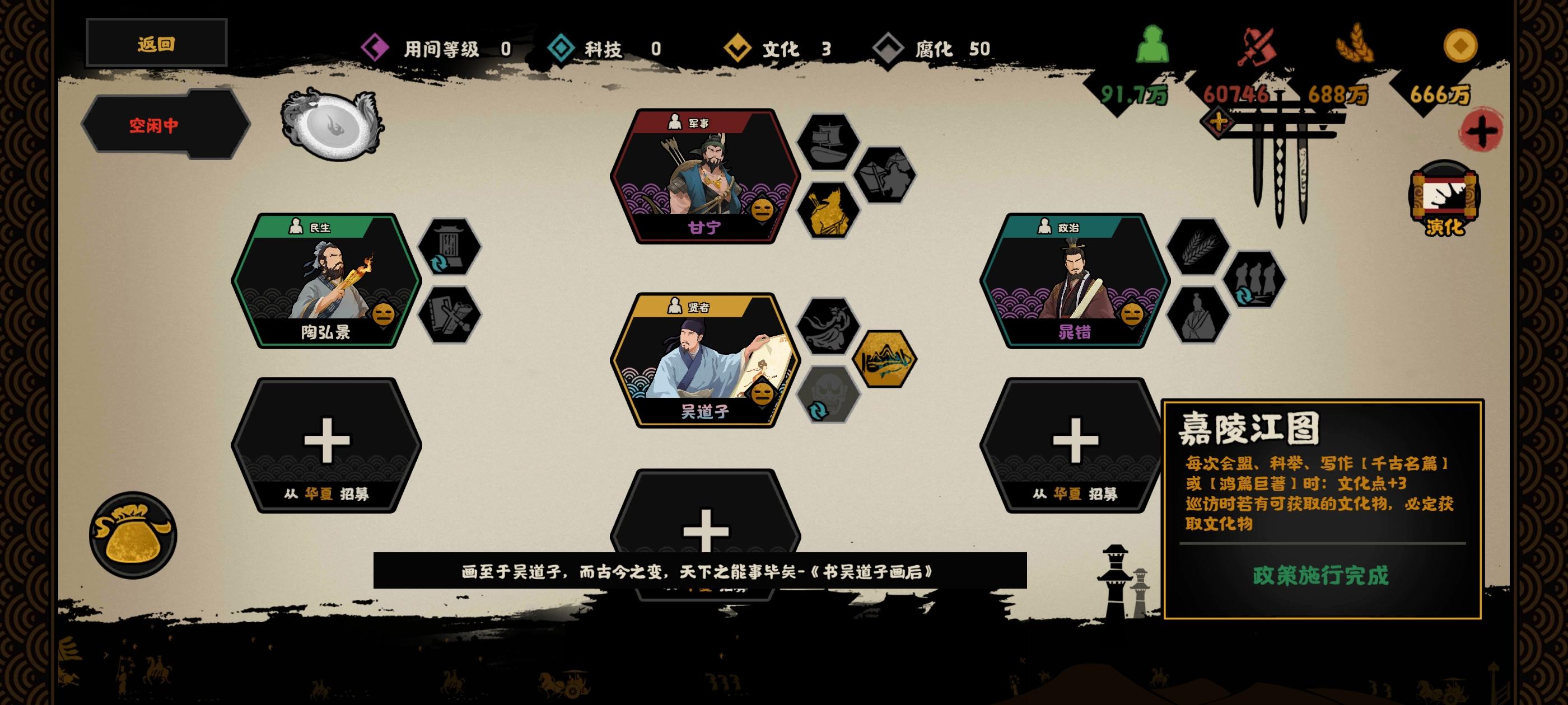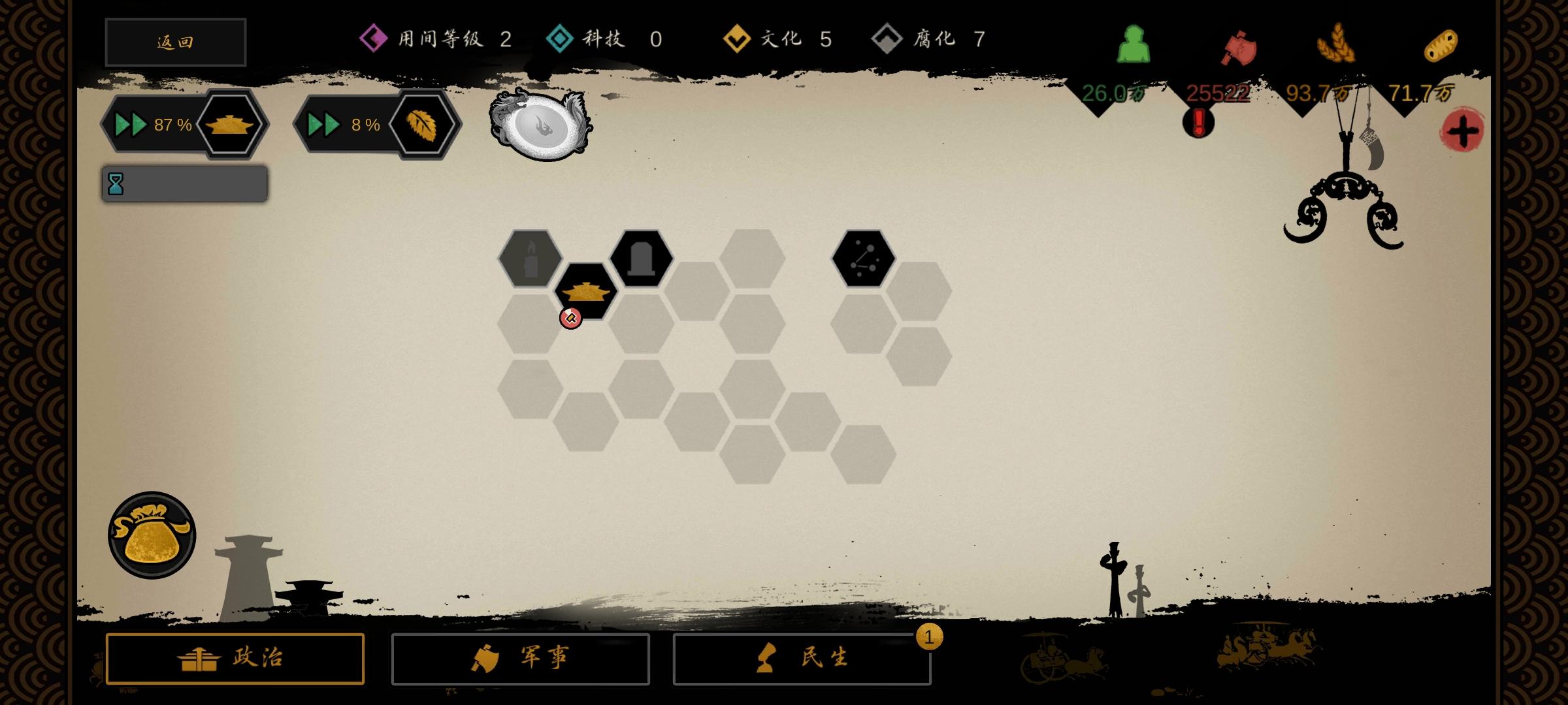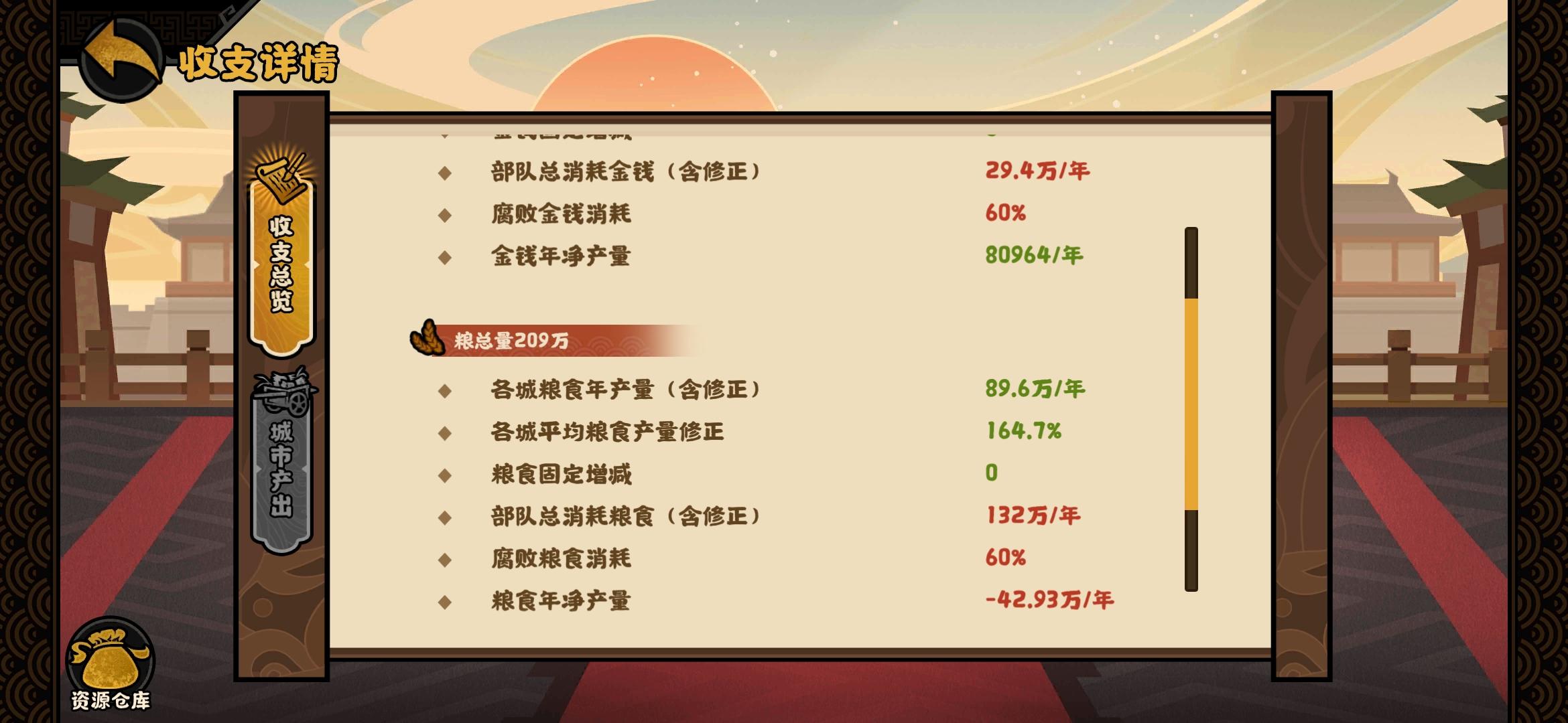 在政策里面加上周期性影响民心军心腐败这些属性的吧,现在没有什么稳定的影响手段就只能干看着,就拿腐败来说我自己的城池腐败基本连10都不到,其他国家的都是60起步,打了几个城池后直接给我干到60%了,我这还是一直都尽可能降低腐败,随便出个兵消耗都是百万起,民心军心也是一样的情况,就那个占卜事件同名占卜出凶的时候就是减民心军心这样的属性,出吉就是加人口士兵数量,就硬是把属性给拉低,这玩着是真难受,在政策