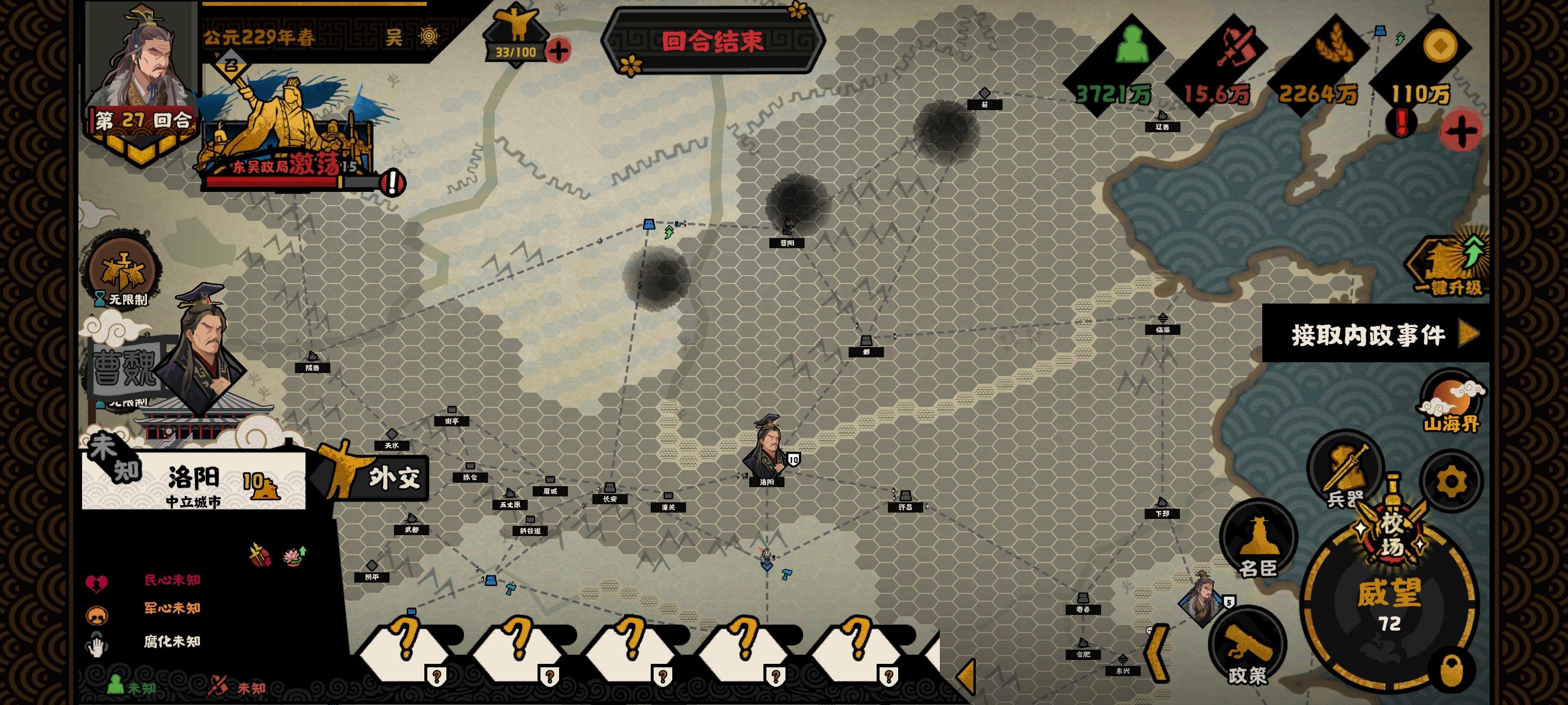 东汉剧本很缺兵 平时发展无法积累兵甲 攻入敌城时也招募不了多少兵甲 就那么一点 简直是杯水车薪其他势力没有移动卡牌 操作太不舒服了 每次都要顶着箭塔进攻 为了体现刘秀的指挥若定 也不用把大家的移动都给去了啊 最起码给一张移动吧不过东汉剧本很简单 感觉没什么难度国特色政策也很有意思 政策实行时间短也不用老是挂机 挺好的这次创新不错 再接再厉!!没带张良 用王莽真的很简单 开局直接乱打就行