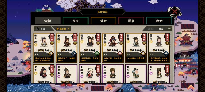 讲一下感受吧。之前我还发过一条吐槽。很期待大汉。希望不要很快就玩腻了。纯刷碎片还是很无聊的。现在嘛。。。卡。。。刚开本没事。越到后面越卡。既然大家都反映这个问题。那大家就不用担心是手机的运存。处理器啥的问题了。刷碎片这个。。。我的建议是。打完结局拿完笔和玉就撤了吧。察举制真的。。。还原历史是好。但是能不能。出来名臣概率高一点点呢。与其在大汉刷不确定名臣的虽然还不如去之前的朝代刷呢。星满了就继续去三家刷经验纹石。还有据点生产的丝绸。良驹的问题。挂机没用。必须干等开着小窗刷视频。。。