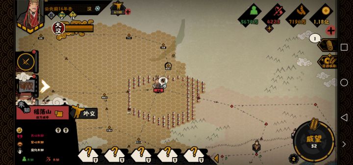 所以说有些玩家大骂匈奴战力过高是错误的,我们其实可以占领这座山来削弱匈奴战力。更何况我看有些玩家顶着匈奴20层的buff和匈奴硬抗,怎么可能打的过呢。别忘了匈奴无论是赢还是输都可以获得钱粮,而且他还有全民皆兵的国策,兵力几乎是很难打光的,所以说匈奴战力很强这不正常嘛
