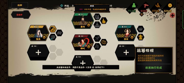 3.民心:商鞅和白起技能消耗民心,前中期民心维持在80左右,后期容易拉高