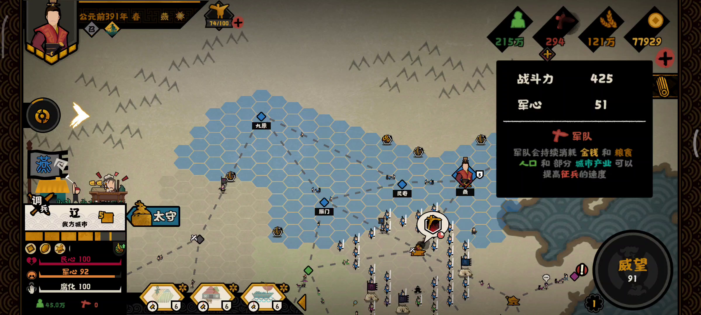 (本来想招募墨子减腐化,但是手滑失误了没招到。军心是最容易加回来的数值,所以减军心比较经济;或许攻占城池数值的不确定性也是一种过扩惩罚)
