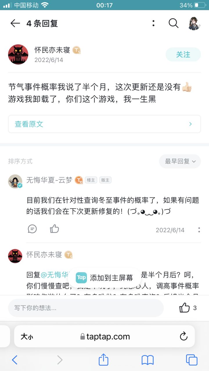 对电蚊拍的话:不清楚为什么给你回复的话,却得到了不能发送的信息。这也让我感到你确实有一些问题。具体是什么问题,我们下面说。什么叫做调高游戏事件的概率?是指专门给冬至提高概率吗?那这样你觉得对其他玩家公平了吗?所以,官方如果要调高游戏事件概率肯定是提高事件出现的次数!那这样的话,你能轻松玩这个游戏了吗?很显然不能。如果没有调高事件次数,我可以忽视一两次事件,也不会扣我很多的数值。但如果事件一