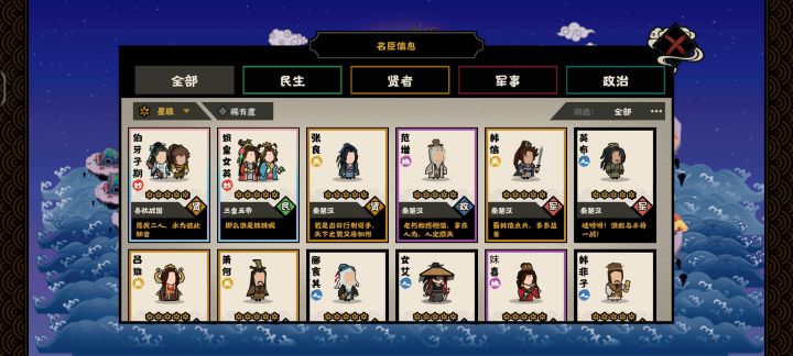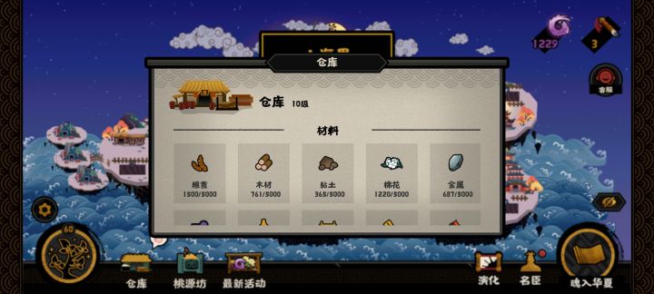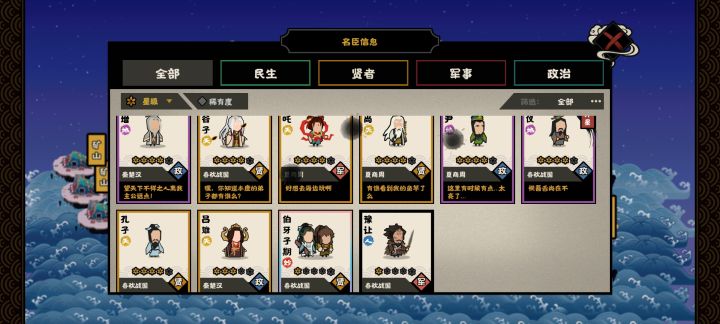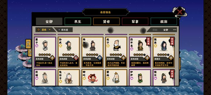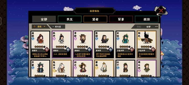 游戏还没出剧本,最近玩的也少了,每天刷刷碎片。晒晒目前状态。名臣等级已经满级了。建筑物还差军营和天机阁还是什么的祭坛,这两个目前九级,还有那个产币的抠门洞,目前8级没升。其他全十级。