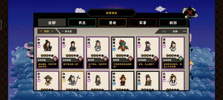 所有政策便宜2块,低于2块的还倒给你钱另外带廉颇减军心,墨子减少探索的不利影响。前期营地战选征兵减军心,军心满足条件后用间sl出齐姜的政策(9粮草),再减对面庙算,去仓库学比干的政策(9粮草)。有两个核心技能后营地商店所有低费用政策、投资政策买买买;投资类买齐,不探索也不缺粮了,然后营地商店buff类买完。中期,粮换兵,去对策点,兵换粮,再买空对策商店后期,,就随意了另:步兵身边有非步兵单