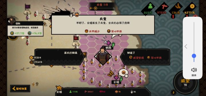首先上图兵变发生有两个条件:一是腐化达80,二是军心达八十(应该是总军心和总腐化)。兵变有这几个特性1.兵变的敌军数量和你的军团规模(也就的是最大出兵数)是一样的(也就是说你的军团规模越大,兵变的兵也越多)。军心也和你的一样。2.敌军用的卡牌跟你的卡牌是一样的(腐化流表示恶心)3.敌军有的兵种和你有的兵种一样如何遇到兵变时,很好的解决呢?那就是……用比干或商鞅压,三皇祭祀,夏商周拒