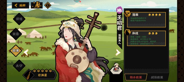 民生位:张骞(目前唯一可以通过技能循环加行动力的名臣)王昭君(班超守西域的神)张仲景(暖身兵法:开局30s内回血可以无视低军心带来的开局兵损)蔡伦(论战常见,卡对方手牌的专家)淳于缇萦(论战常见,惜命兵法撤退可以回复更多血量,剧本中“惜命”触发有前提条件出场率较低)解忧(活动华服小公主,论战常见开局可生成两队骑兵,剧本几乎没有相关阵容推荐)军事霍去病(10%战胜夺取➕累战效果➕破敌