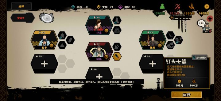 只适用于普通和困难,挑战也能用但是效果远远不如普通困难开局陆压加妺喜,民生位和贤者随便选,不过不要选增加钱粮消耗的大汉的基础战斗力底,只有一百出头,其中匈奴的基础战力开局是105,鸣镝加100%变成105*2=210先选择陆压,这时候匈奴是好感最低的国家,直接用钉头七箭,削弱匈奴40战力,这里削弱的是基础战力,也就是基础战力变成105-40=65了,相当于削了匈奴80战力(我的陆压没到满星,