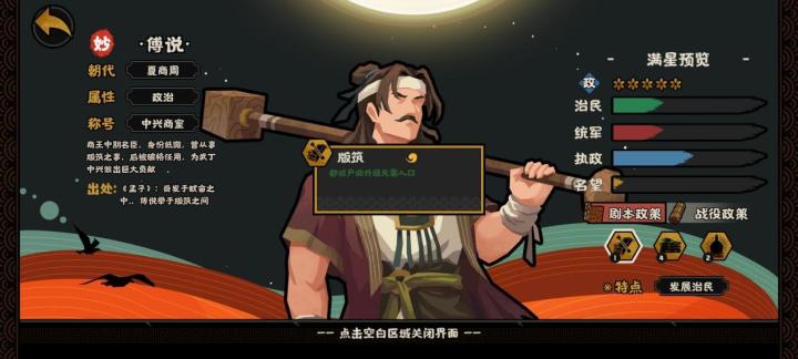 近期本人继续更新水文章,文章的主题是有关于傅说的技能分析,可能之前有很多人更新过这个,本人今日还是老生常谈于这个话题。当然如果有帮助的话,那就更好了。 先说一下傅说(yue)的人物生平,他是殷商时期卓越的政治家、军事家,辅佐殷商高宗武丁安邦治国,形成了历史上有名“武丁中兴”的辉煌盛世,留有“知之非艰,行之惟艰”的名句,被尊称为“圣人”。武丁即位后,设法找到了他并拜傅说为宰相。傅说从整饬朝纲开始,