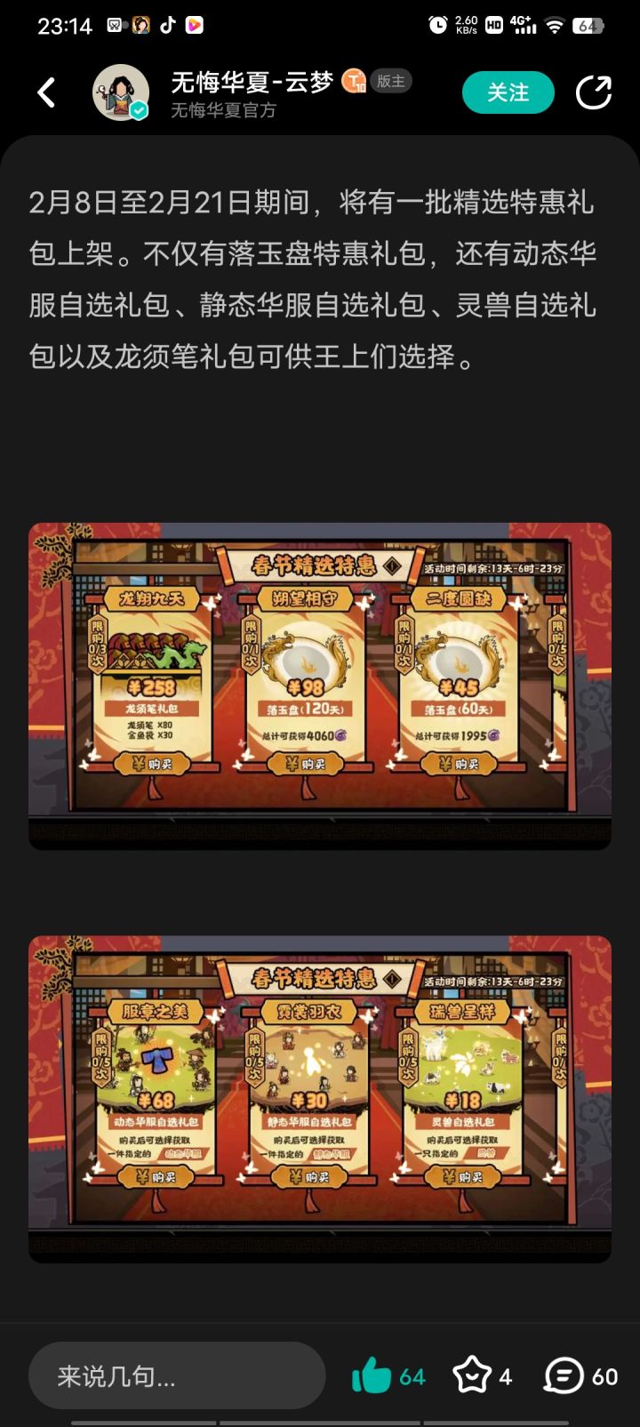 你们说你们说这动态华服自选有没有哪吒的莲花复生?关羽的关圣帝师?有的话我就不肝了,在者有没有赛季角色的皮肤?刑天的是没可能了你们说呢。