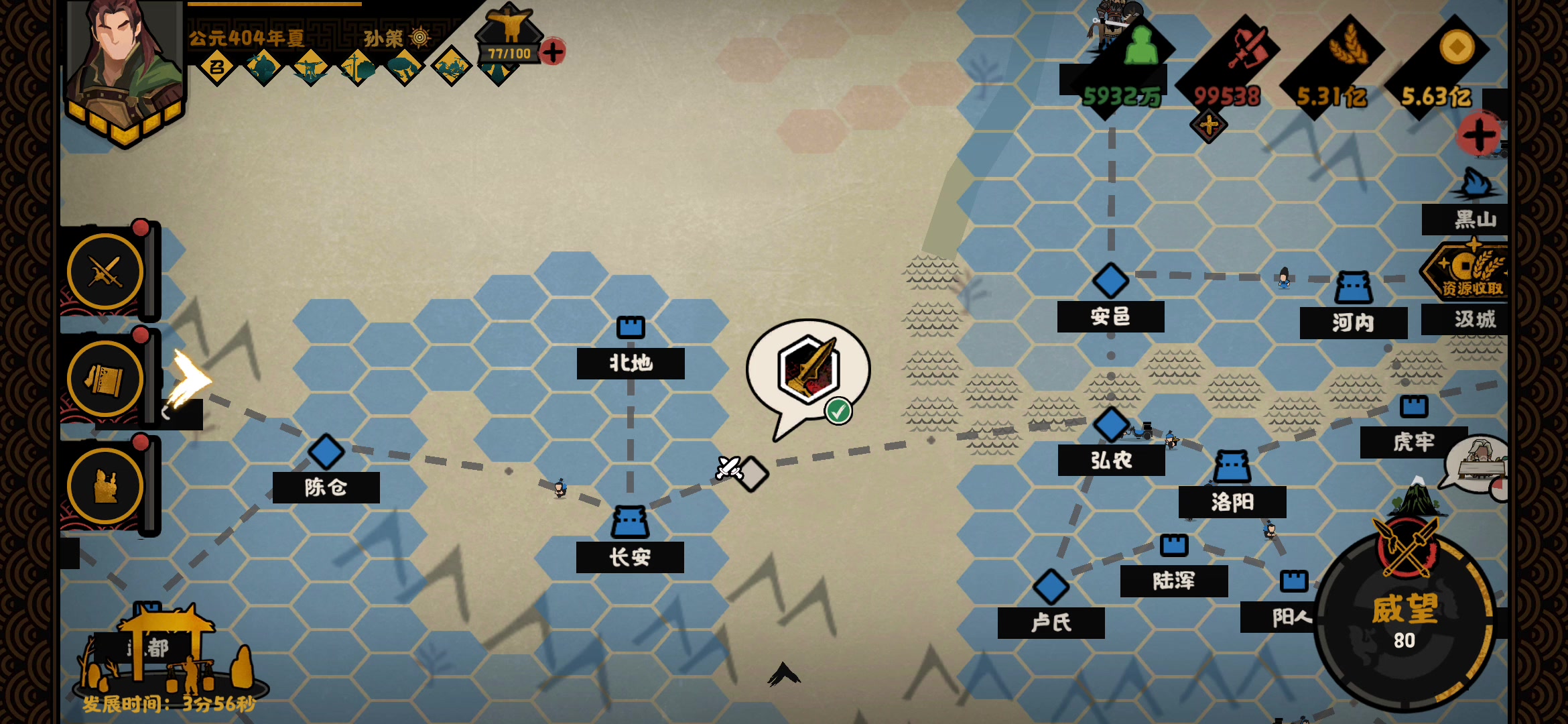 打得太煎熬了(打了有两天多)义军势力的特点是有且仅能占领一个城市。每次完全进攻胜利,可以选择两项。第一,失去原首都,迁至这个城市,然后5年内获得战力+20%;其二,获得钱粮还有资源,并把城市变成自立城市,15年内自立城市不可被进攻,但可以借道。过了自立城市buff就变成白城。关于名臣,其实我打得比较随意,因为我的名臣等级都不高,所以就带来刷刷碎片。像打东汉副本,军事位带个卫青
