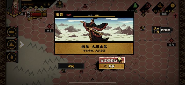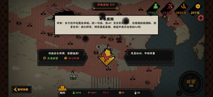 昨天其实就已经把大汉给通了,怎么说呢,前期还是很惊艳的,那种对抗匈奴的紧迫感是其他朝代没有的。但是自从打通河西走廊,就有些不对劲了。首先,是同一个事件一直触发,就是那个要给宫里添加侍卫的事件,点掉了一秒钟之后又刷,我直接把腐化降成0,开了次会盟又把威望刷满。后来实在受不了了,重开了一下游戏才好。再一个就是名臣探索机制是不是有问题,还是有其他获得方式?我满军心民心威望刷了两百年都没刷出来一个名臣,