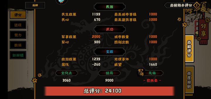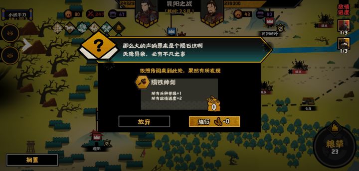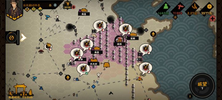 东汉通关有一些很有趣的体验,《匈奴竟是我自己》《北新南汉》《孔子:工匠制作机》《马援:马匹制作机》《王莽:这就是“绝”战吗?》并且这句运气超好,陨石触发了三四次。明天准备再来一局挑战,我比较推荐萧何,孔子,商鞅,萧何举士招人,另外守国可以周转一下;孔子,工匠制造机,另外加民心;商鞅,减腐化,重点是东汉太容易低民心了,不加民心够呛得谥号。还有,我第二天通关不算很慢了吧……最后,平原小姐姐真美。