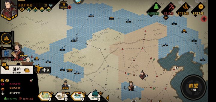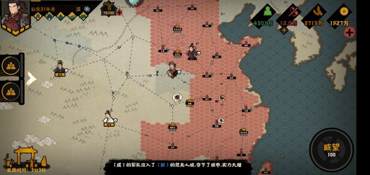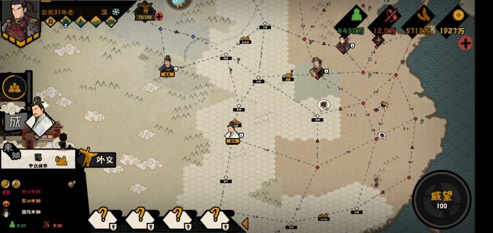 求助 我是想挑战模式得到光,武两个谥号的,目前只剩下四国。 陇西只有一座城,基本上有没有都一样。 王莽被我削的有点儿厉害,让成占了便宜,拼命打王莽,现在只剩下十一座城了。 成在战斗力和城数上比我略差,有十五座。 目前我有三种选择:北上攻新,西征成,或者两个都打。帮我选选。